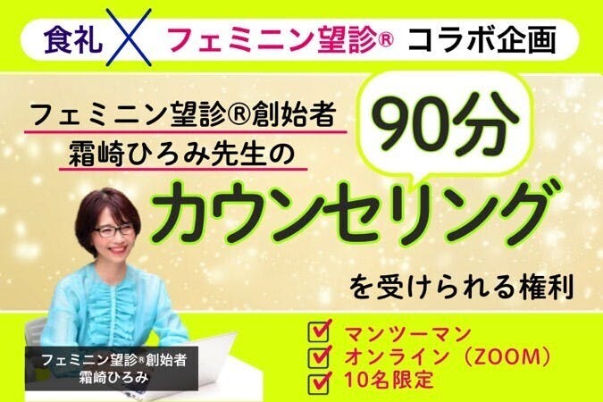 フェミニン望診創始者の霜崎ひろみ先生と食礼のレノンリーとのコラボ企画の実現を記念して、霜崎ひろみ先生より特別価格でのカウンセリングのリターンをご提供していただきました!
