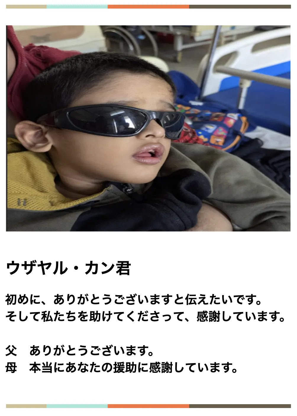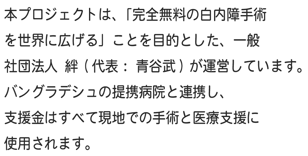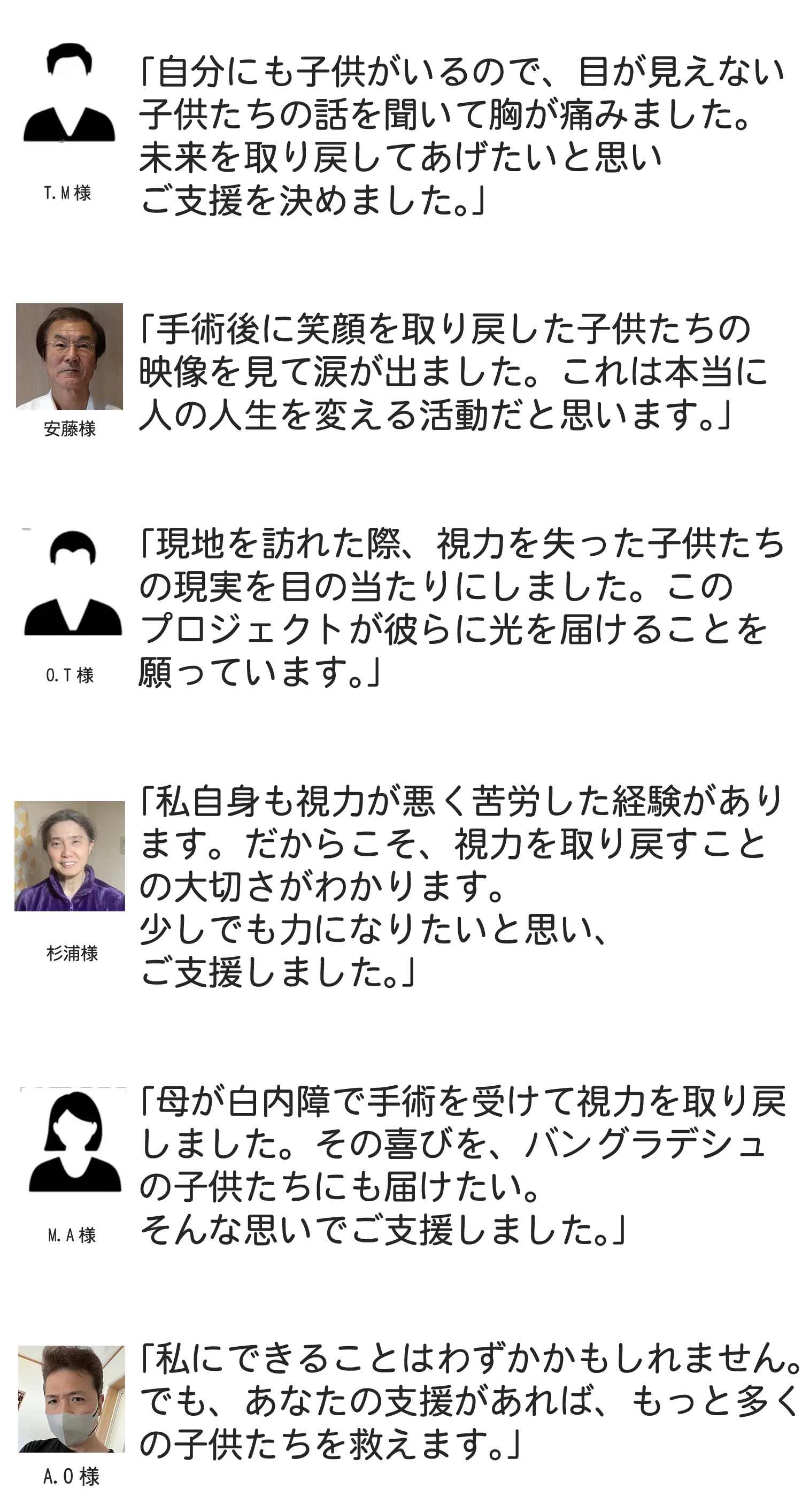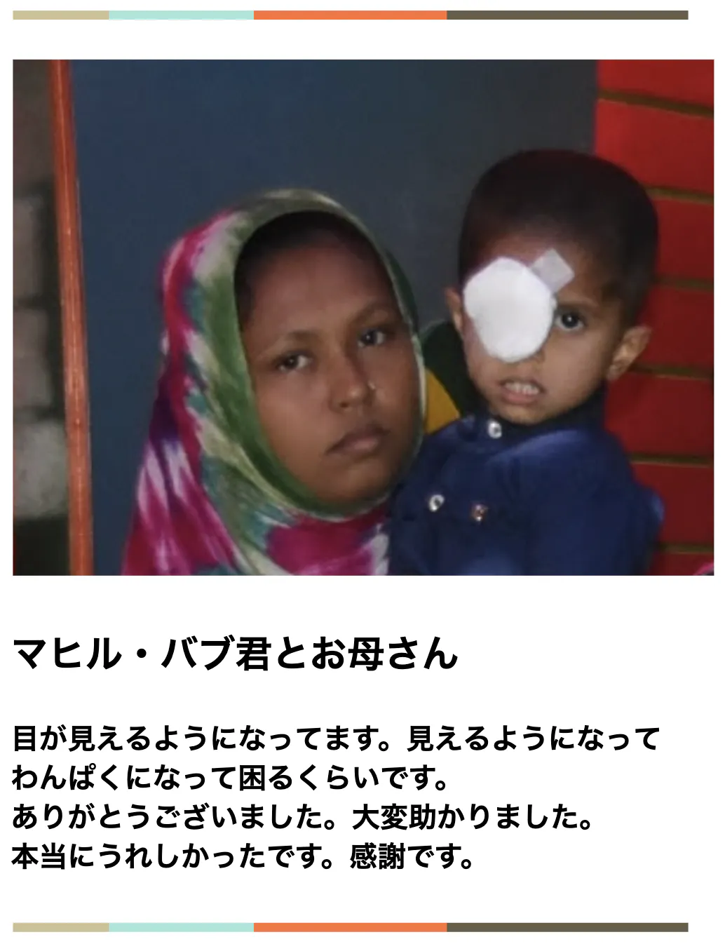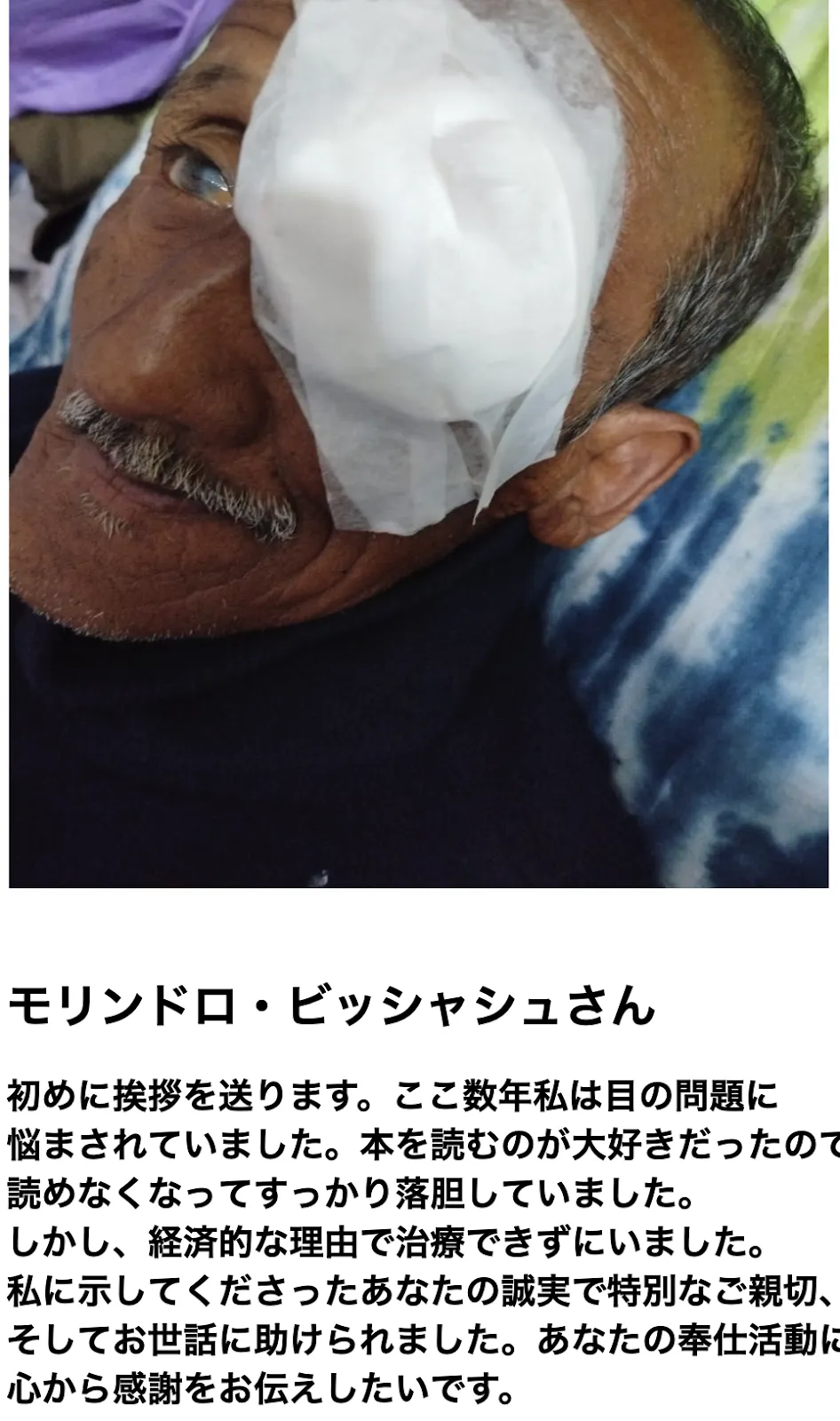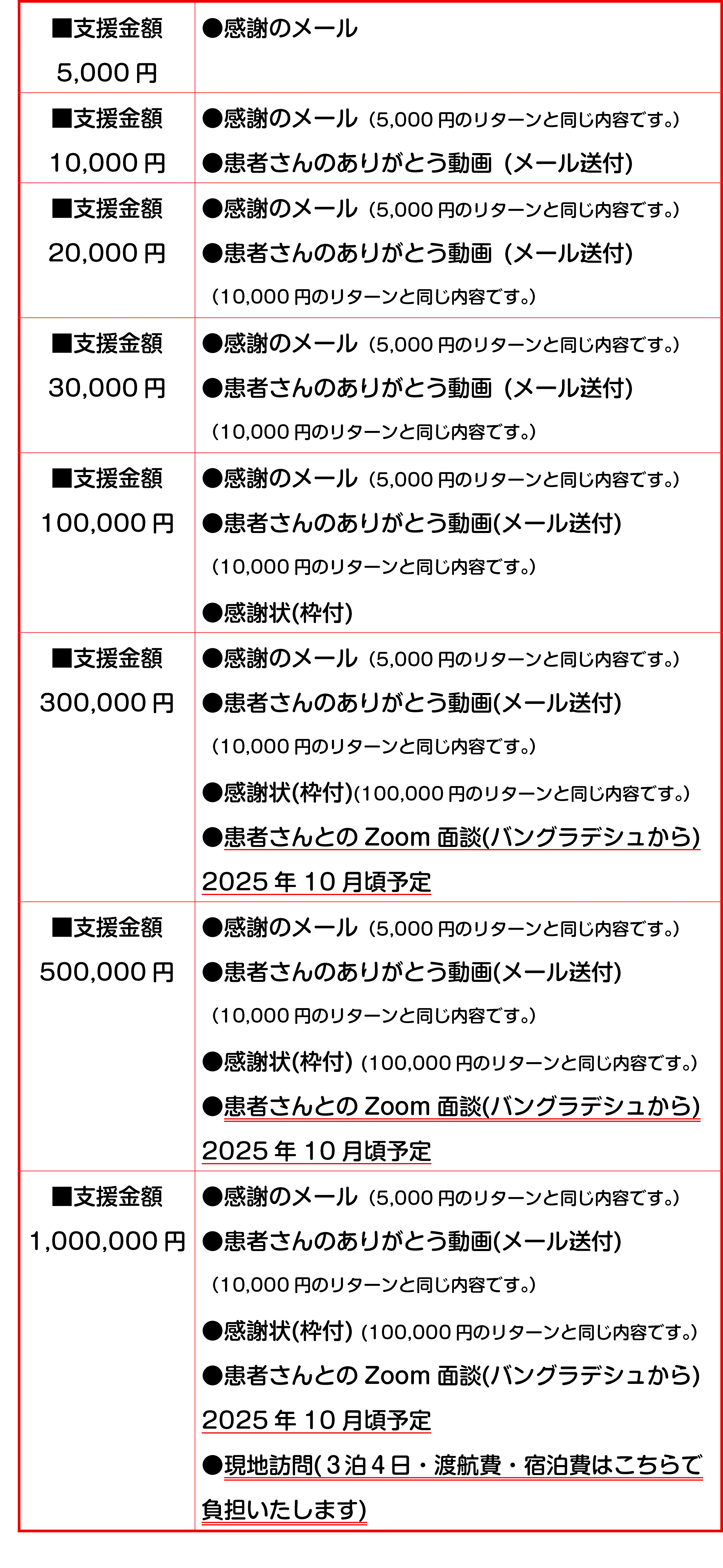 【お礼のメッセージ&現地訪問ツアー】 感謝の気持ちを込めて、お礼のメッセージをお送りします。(5,000円と同じリターン内容です。) 患者様からのありがとうの動画メールを送りします。(10,000円と同じリターン内容です。) 感謝状(枠付き)を送ります。(100,000円と同じリターン内容です。) 患者さんとのZoom面談(バングラディシュから2025年10月頃予定)(300,000円と同じリターン内容です。) 現地へ訪問ツアーを実施いたします。(3泊4日、宿泊費・旅費・ガイド代金込み。) 現地ツアーの予定につきましては、プロジェクト終了後に現地スタッフと予定を合わせて決定いたします。 現地ツアーの実施予定は2026年1月を予定しています。