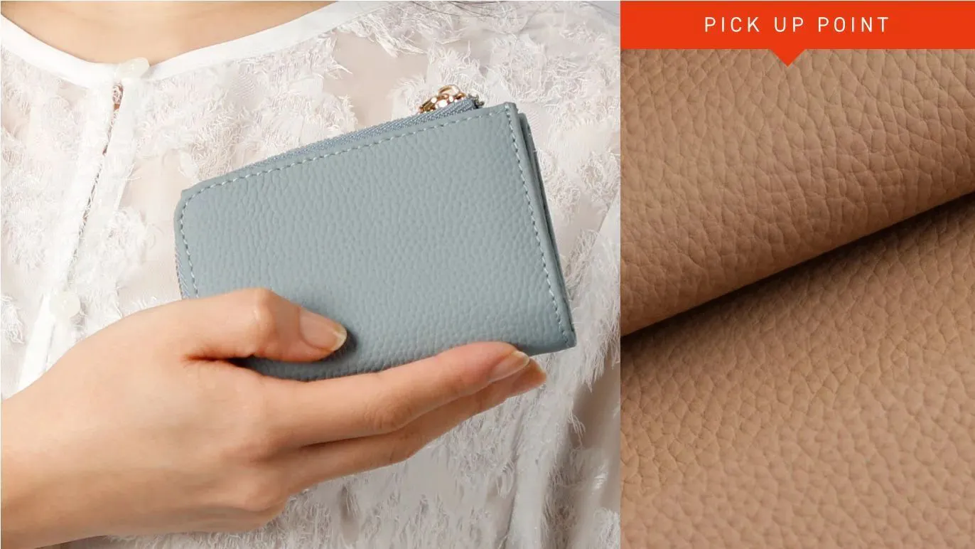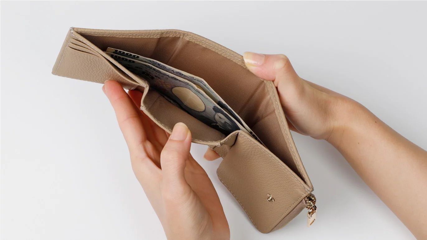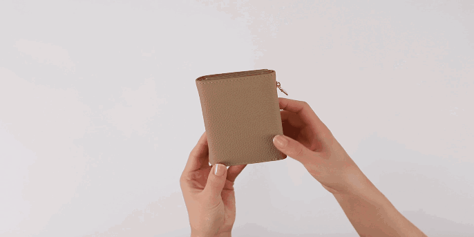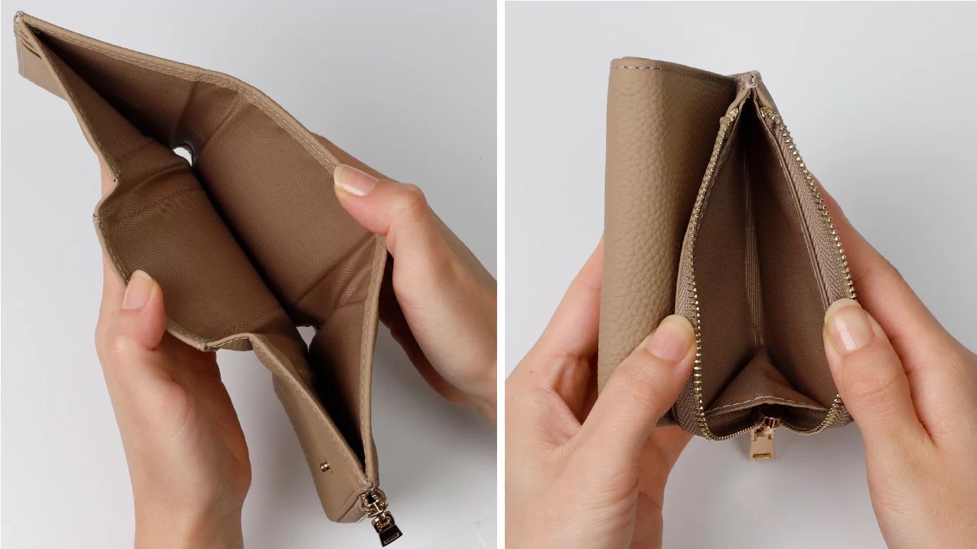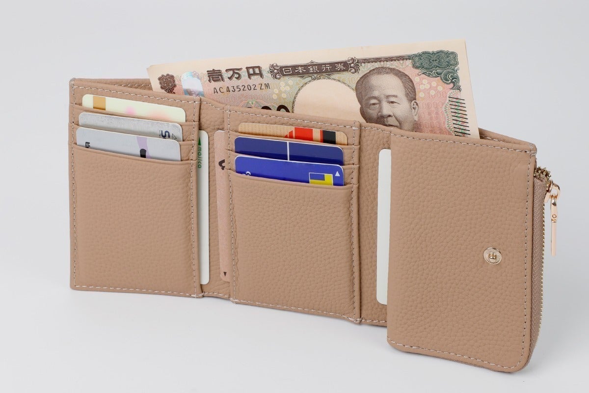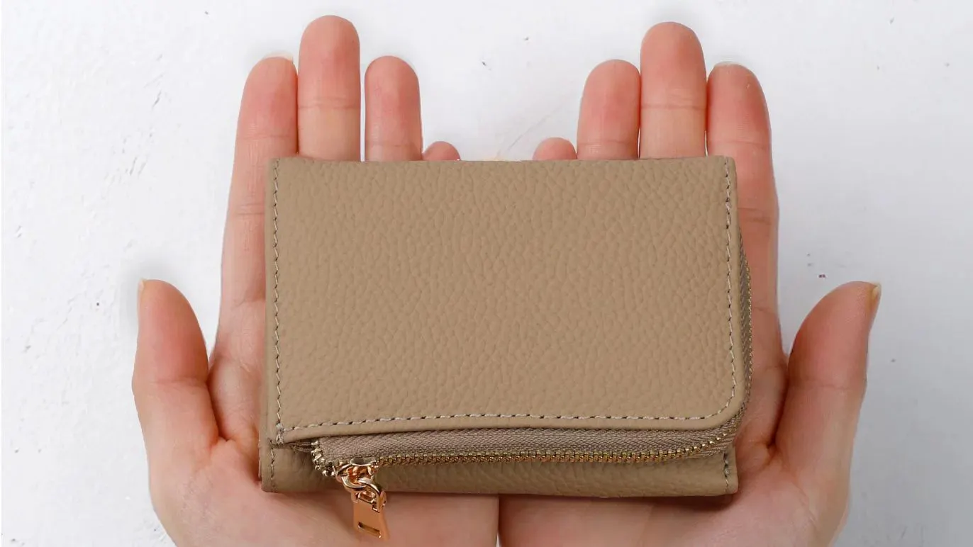 小銭入れとカードスペースの一体感を高めた、コロンと小さくかわいいフォルムは、三つ折りのため幅が抑えられているので、手のひらに収まりやすく、バッグの中でも場所を取りません。