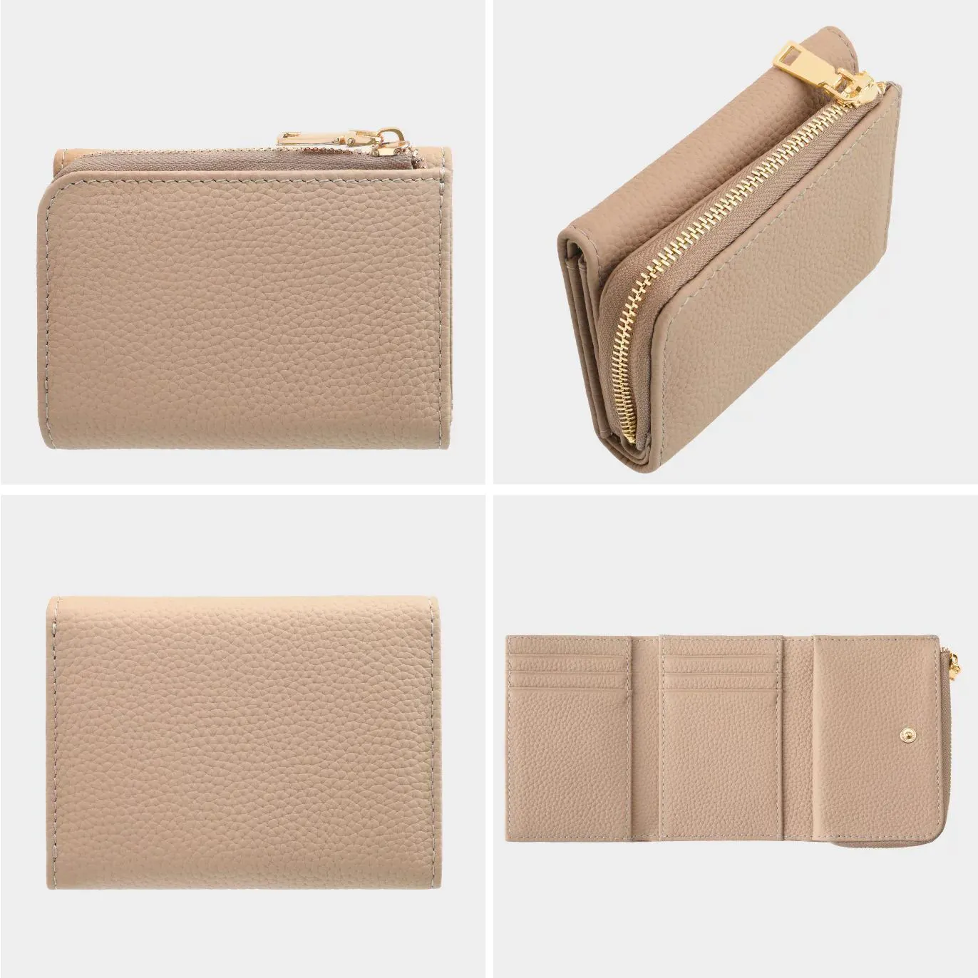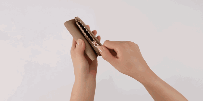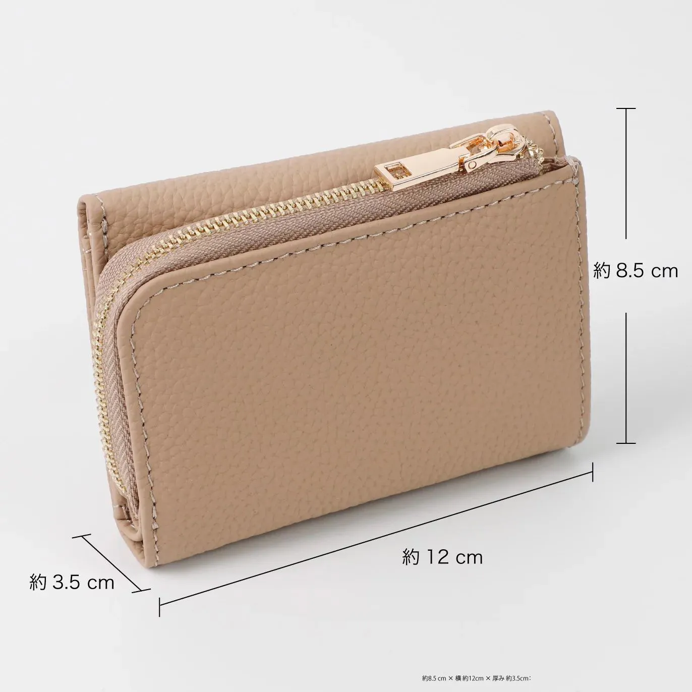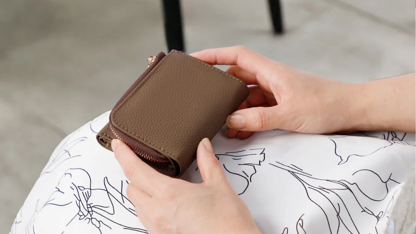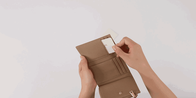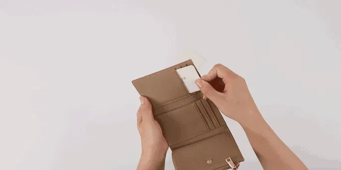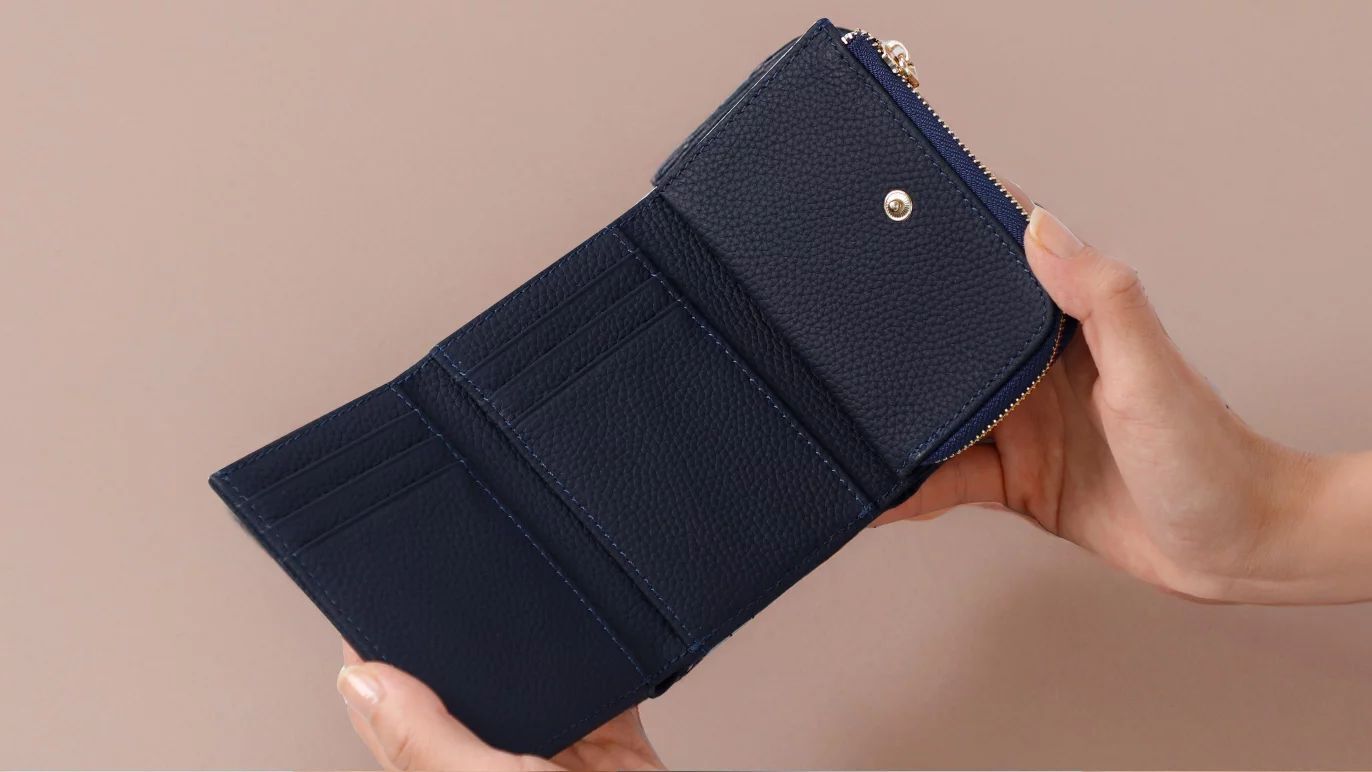 小銭入れとカードスペースの一体感を高めた、コロンと小さくかわいいフォルムは、三つ折りのため幅が抑えられているので、手のひらに収まりやすく、バッグの中でも場所を取りません。