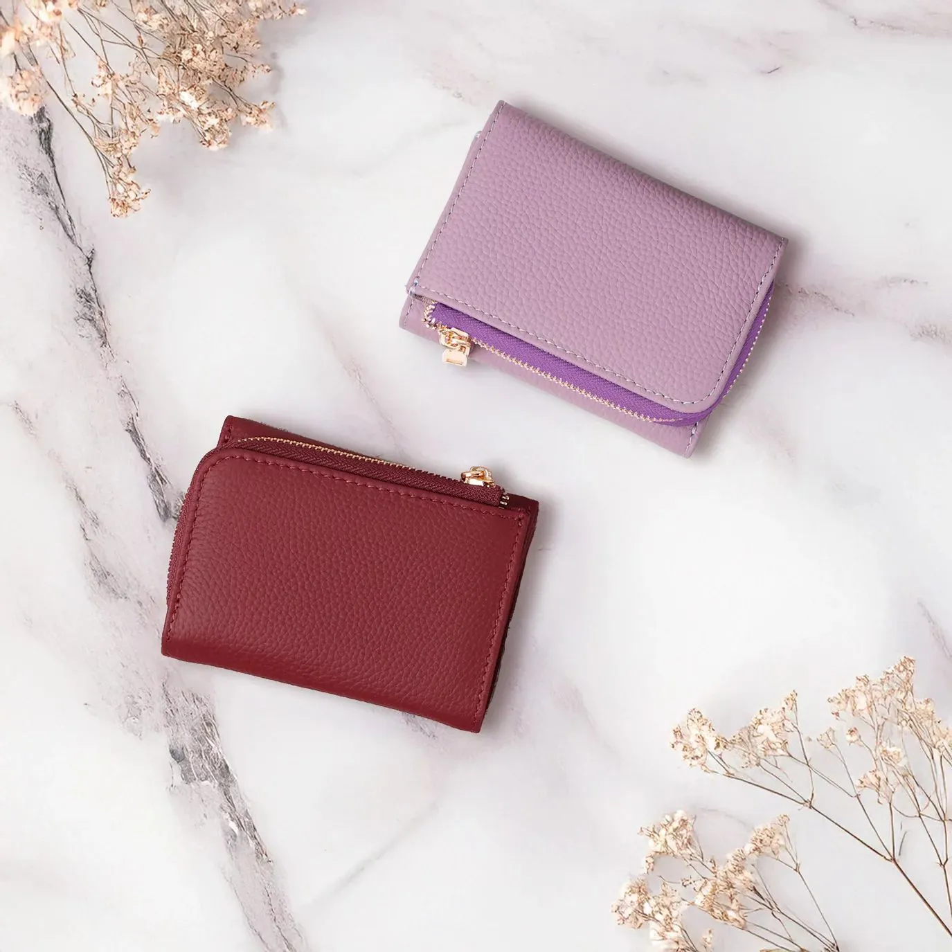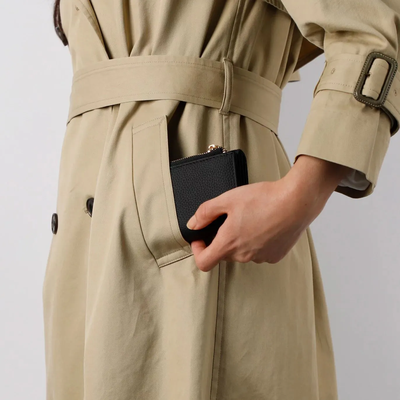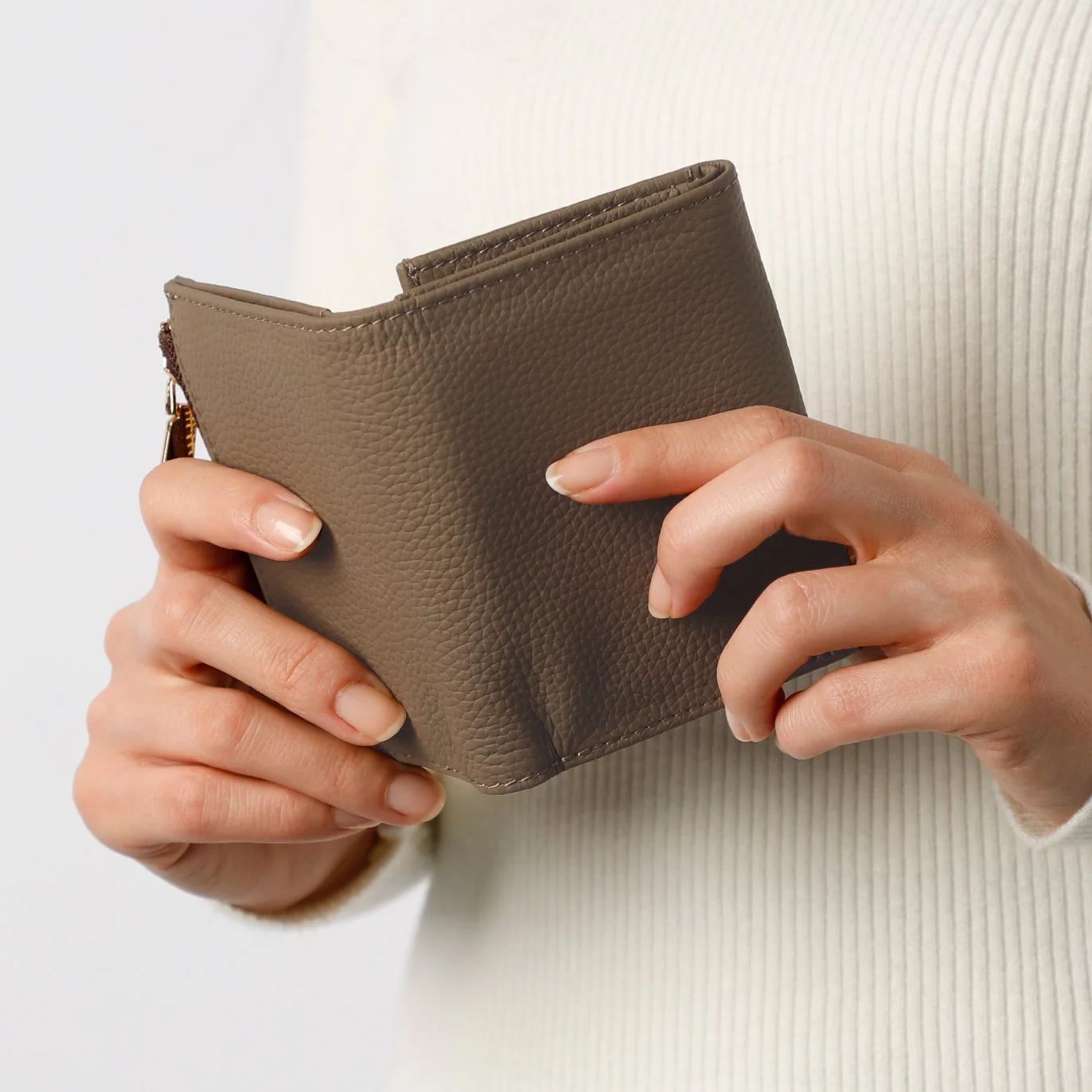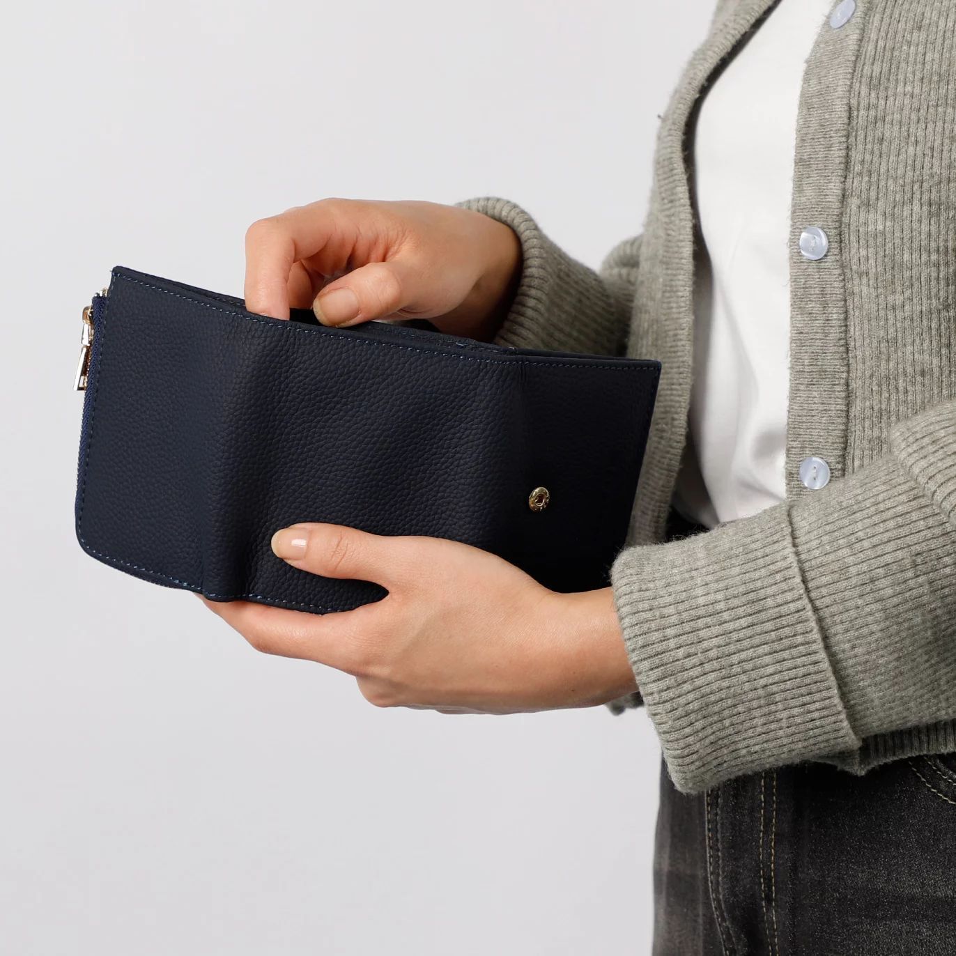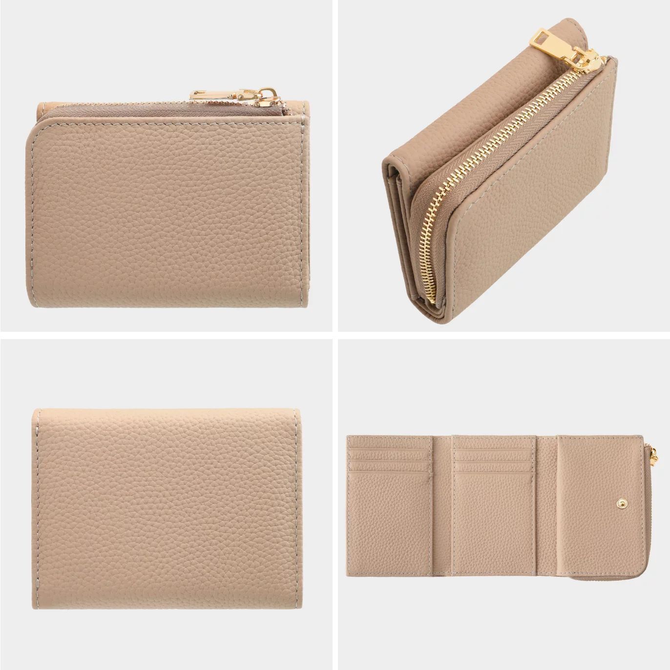 小銭入れとカードスペースの一体感を高めた、コロンと小さくかわいいフォルムは、三つ折りのため幅が抑えられているので、手のひらに収まりやすく、バッグの中でも場所を取りません。
