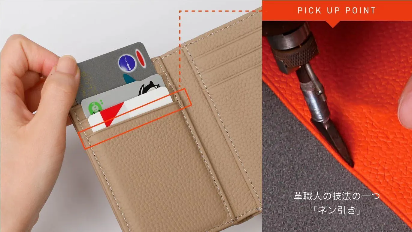革職人の技法の一つ「ネン引き」で、カードポケットの端部一つ一つにアクセントと高級感を与えています。