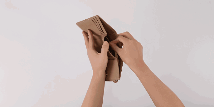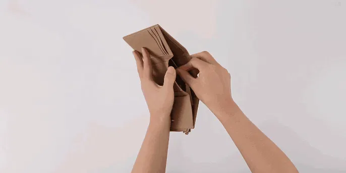 札入れは、三つ折りで仕切りもないので、余裕のあるスペースをゆったりとご利用になれます。お札を折らずに入れられて、出し入れもしやすいです。独立したスペースなので、他のスペースに入れたお金やカードがこぼれたりしません。