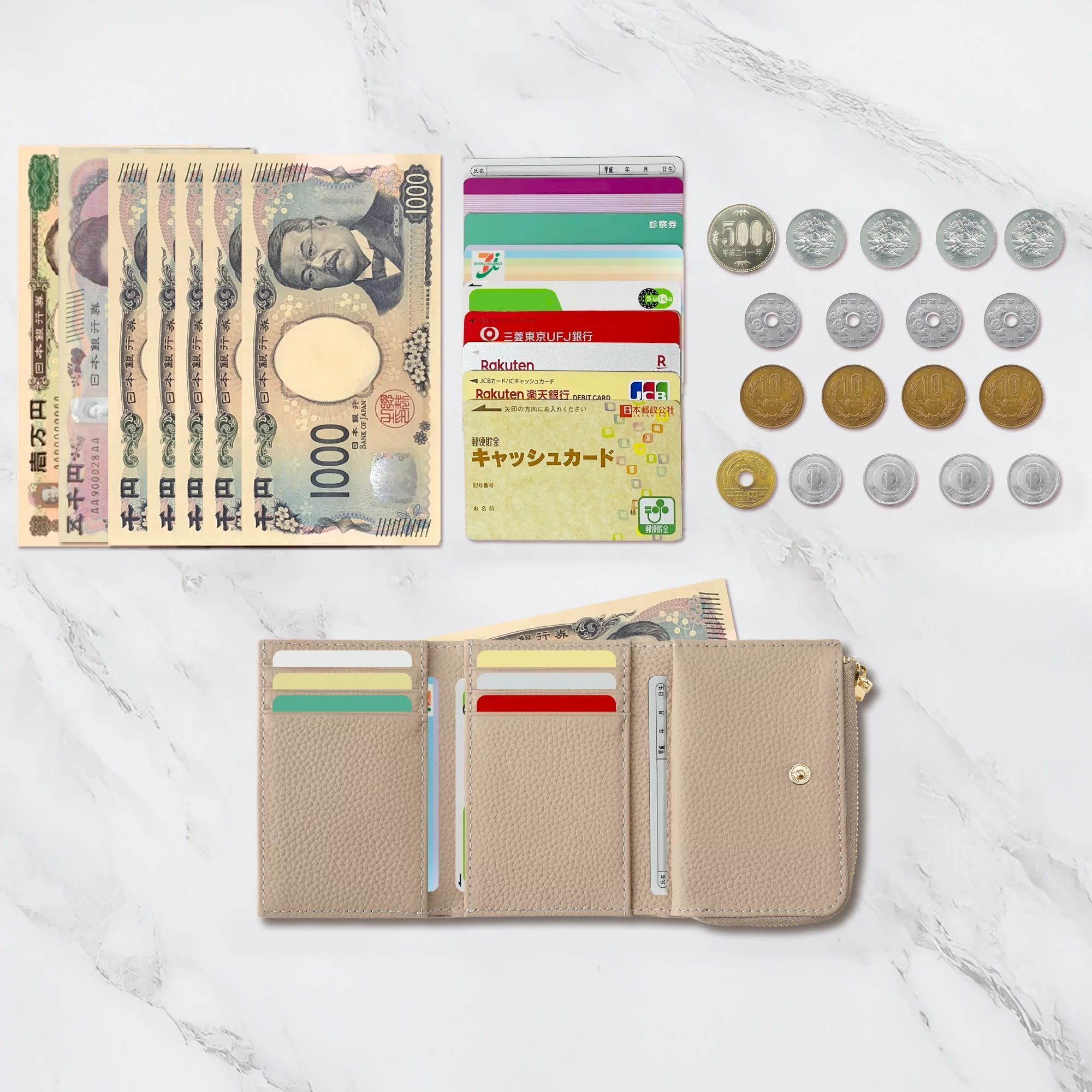 比較的コンパクトではありますが、小さすぎず意外な収納力を発揮して、お札10枚と999円分のコイン、9枚のカード(厚みは様々)を入れても形が崩れにくいです。