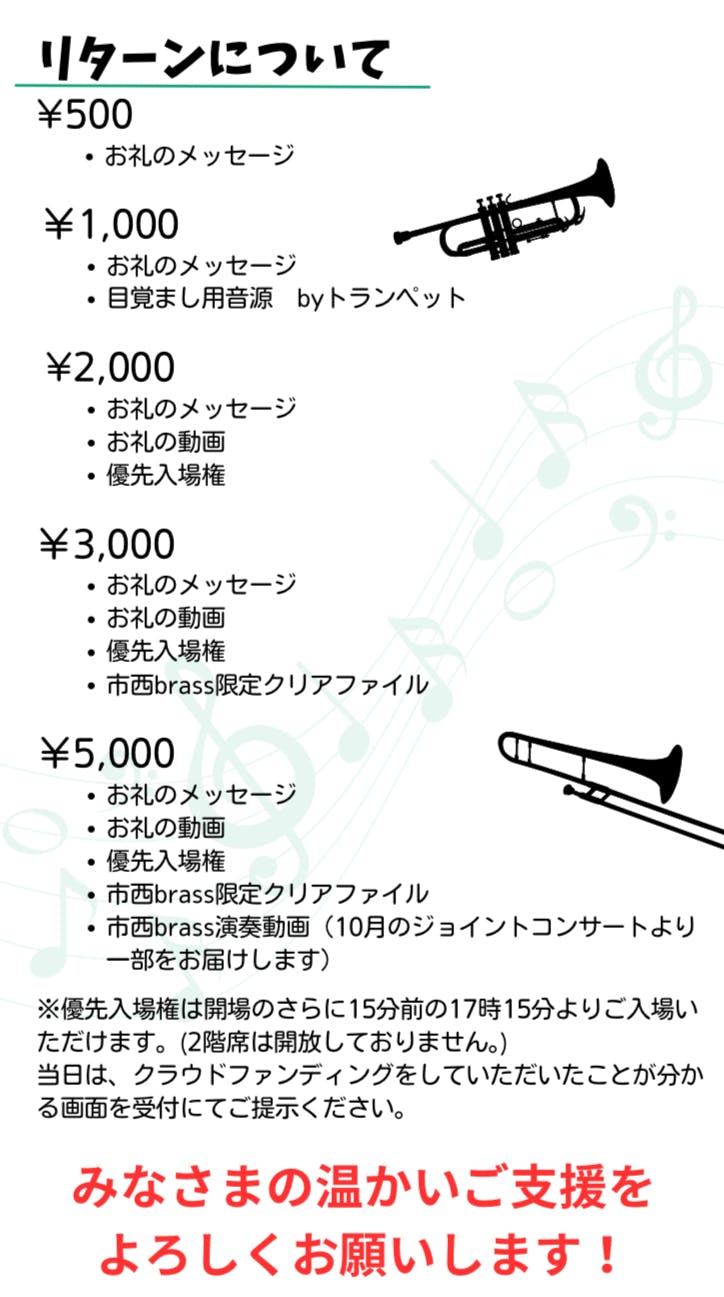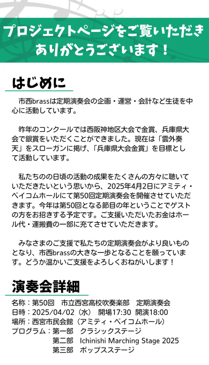 2025/04/03 17:07おかげさまで、昨日無事に定期演奏会を開催することができました。今回のクラウドファンディングにご支援いただいたみなさま、本当にありがとうございました。引き続き市西brassへのご支援、ご声援をどうぞよろしくお願いいたします。 もっと見る