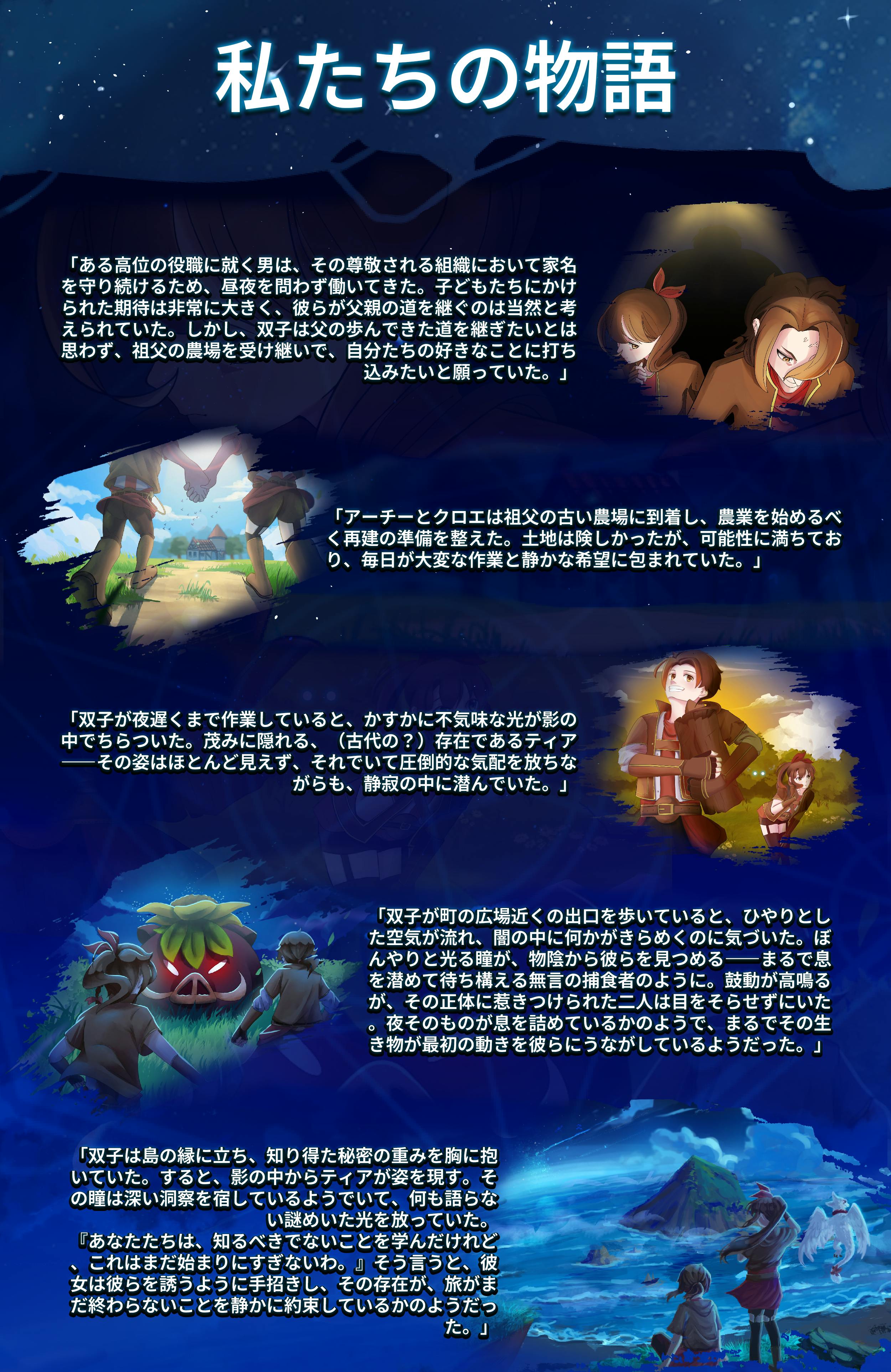 プレイヤーであるあなたは、アーチーまたはクロエとして物語を進め、祖父の農場を再興し、クローバー諸島の秘密を解き明かし、人間とモンスターが共に生きる未来を築くことができます。