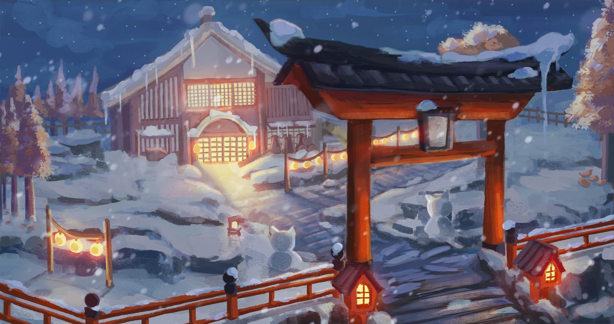 厳しい雪山に隠された秘境の村。剣の達人と修行し、温泉宿で体を癒やし、神社で盛り上がるお祭りを楽しもう。