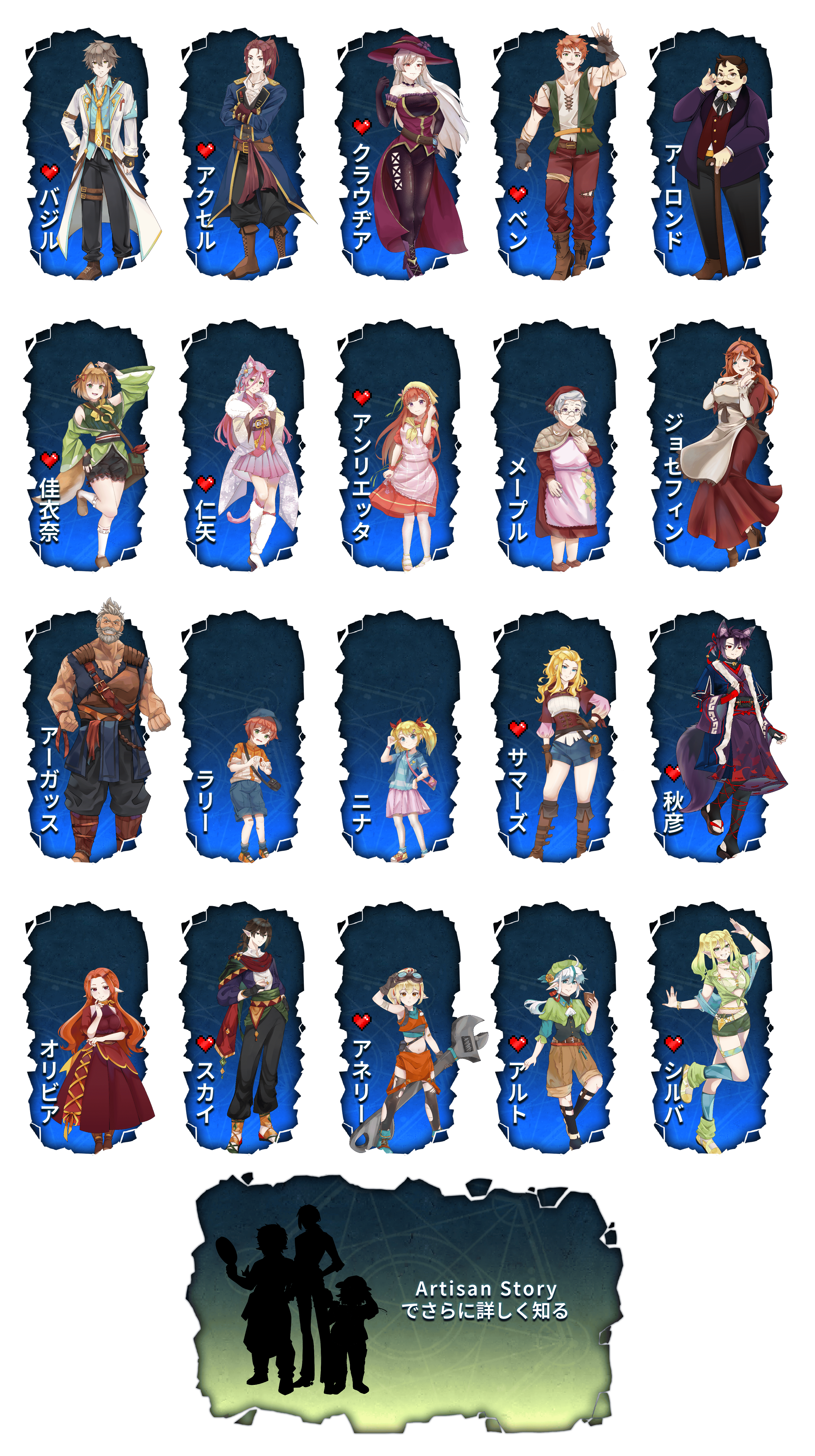 アルチザン ストーリーでは、個性豊かなロマンス候補キャラクターとの、特別な関係を築けるチャンスがあります。それぞれのキャラクターは、独自の物語や個性、そして夢を持っています。クローバー諸島の美しい地域を巡りながら、心のこもった会話や共に過ごす体験、思いやりある行動を通じて絆を深めましょう。