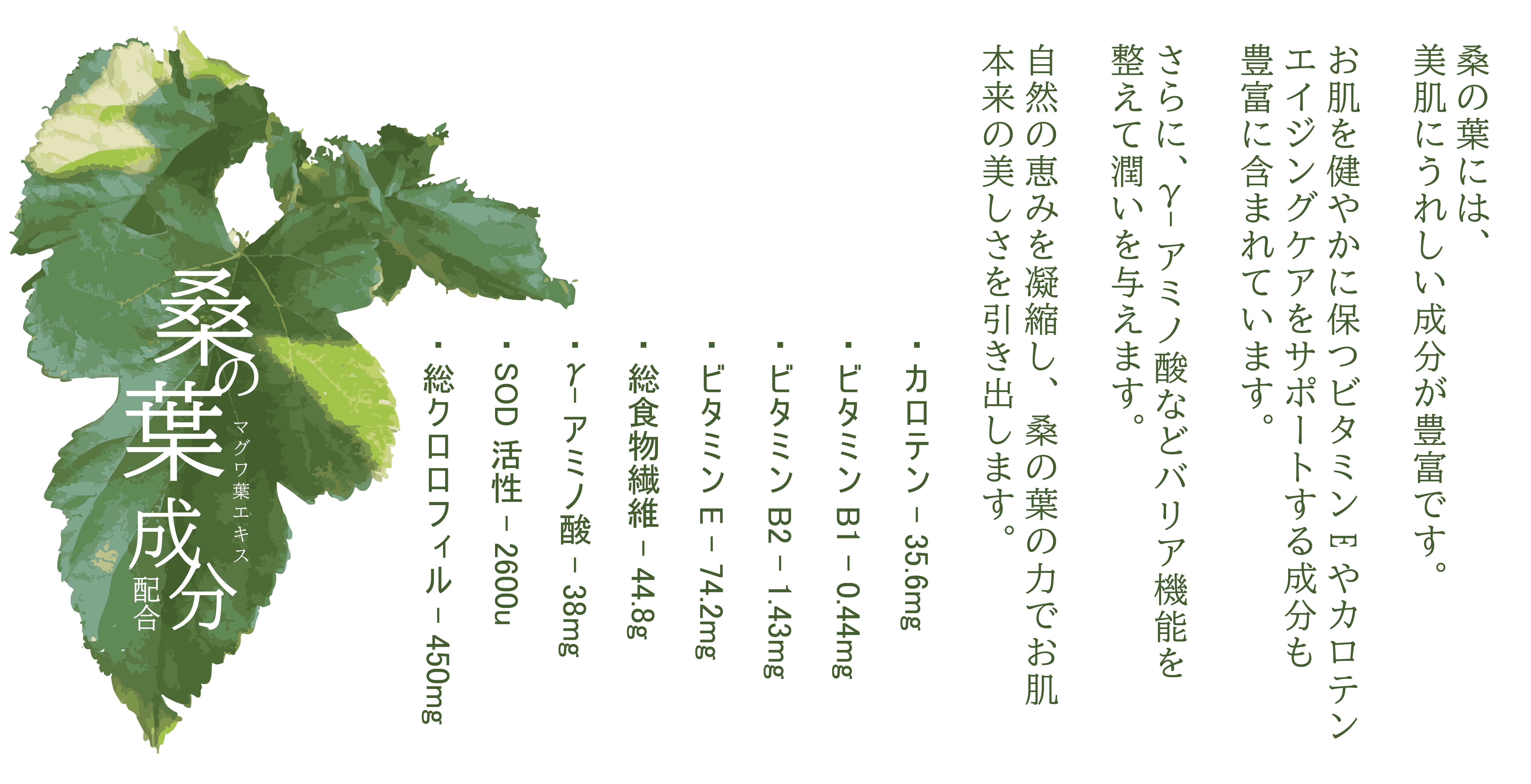 《桑》の葉から抽出される「マグワ葉エキス」は、ビタミンやポリフェノールを含み、お肌を整えエイジングケアが期待できる素材。