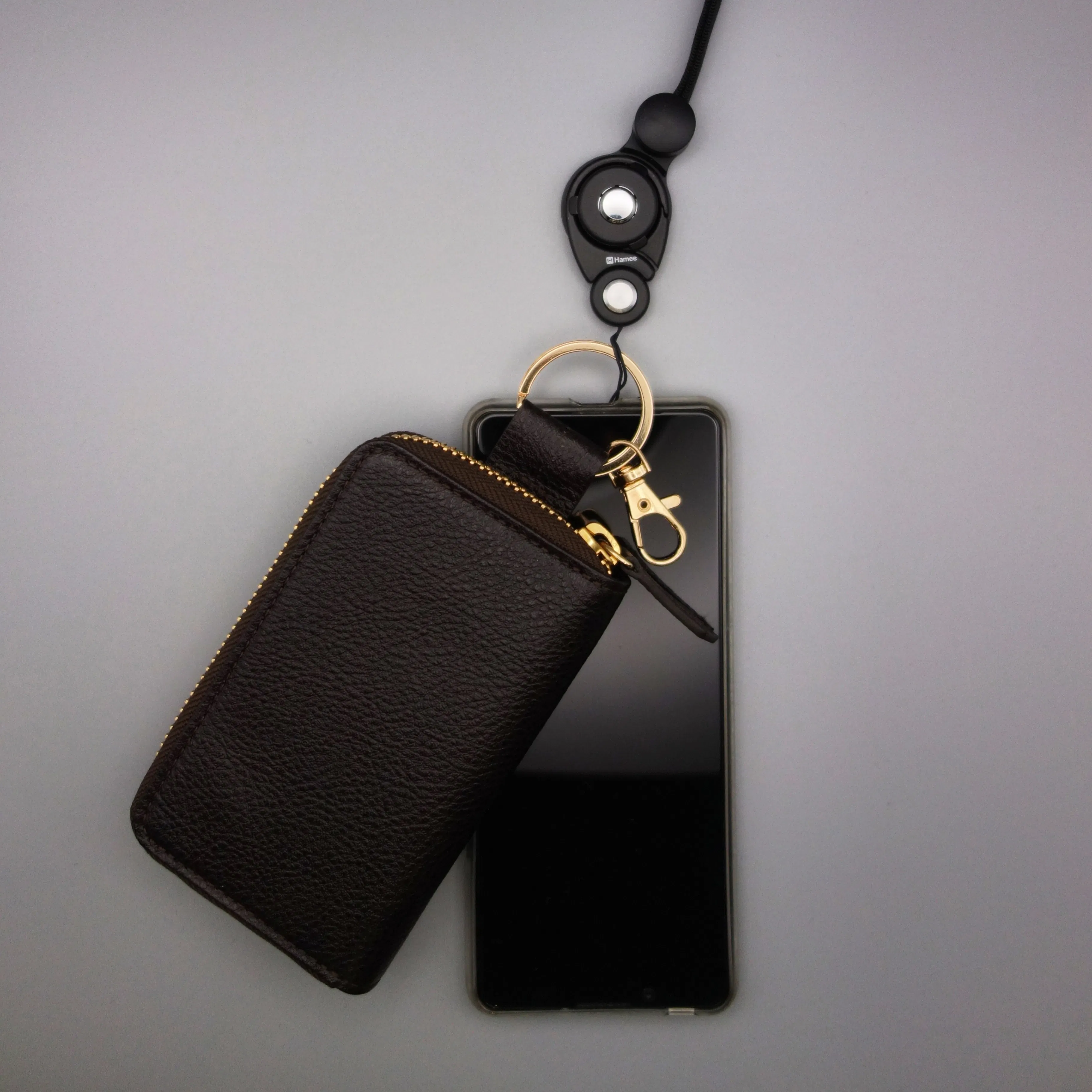 ①引っ掛けて持ち出す財布。スマホショルダーに引っ掛けて、一元管理。