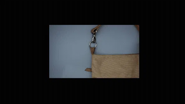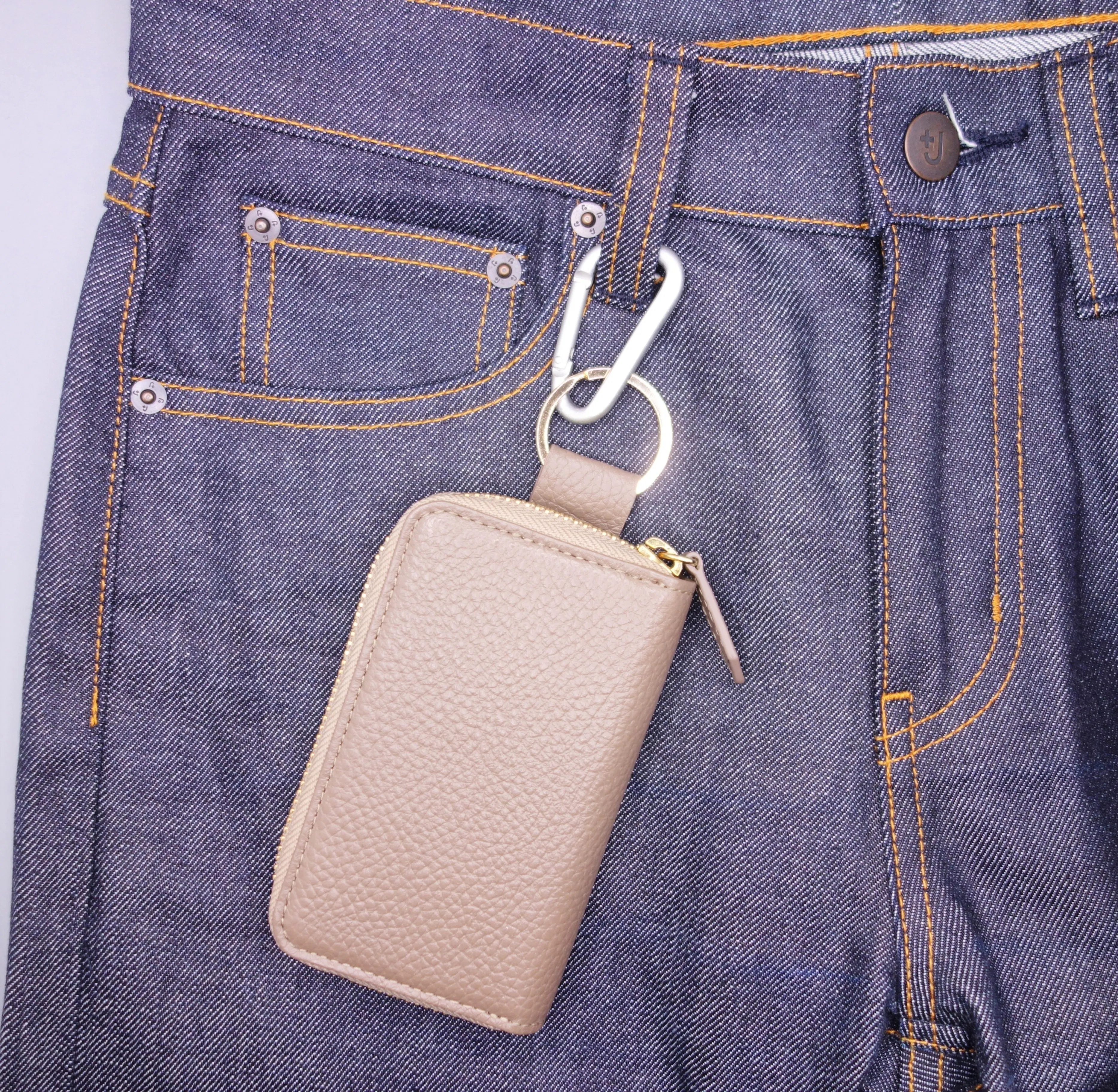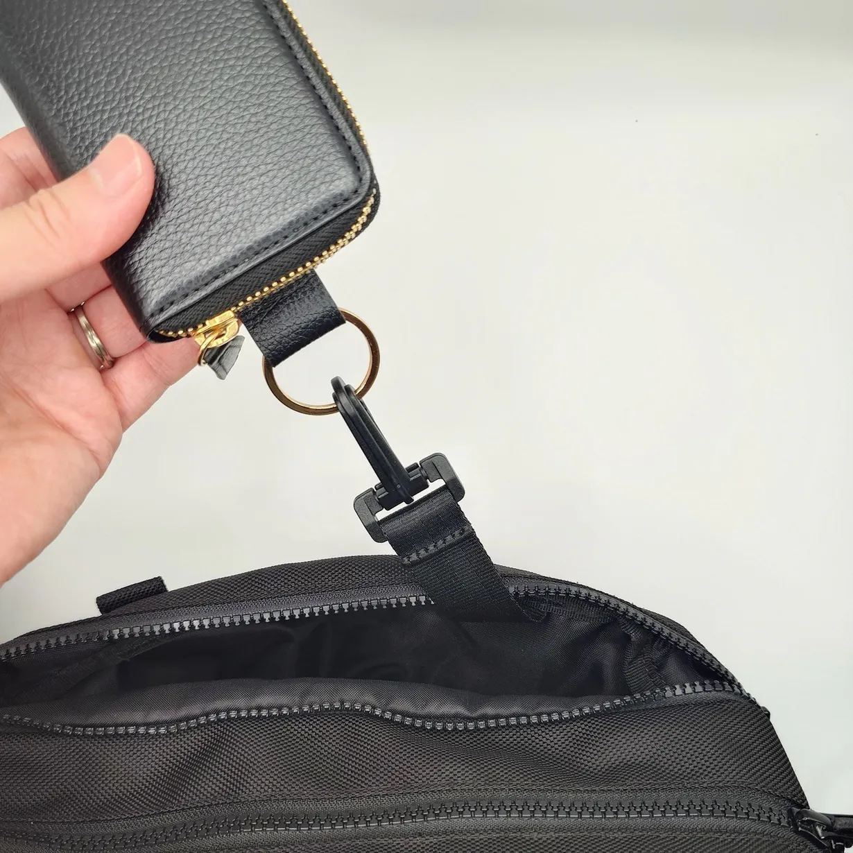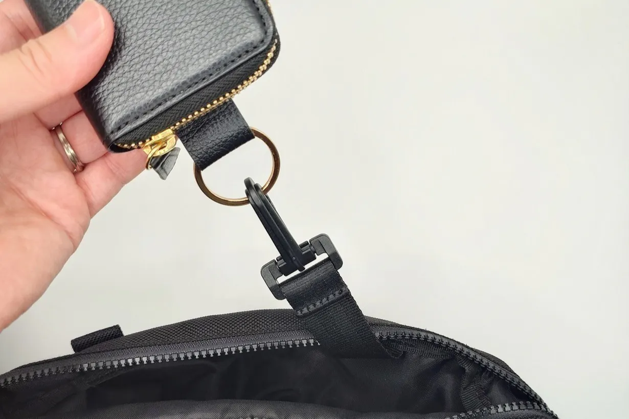 ③財布を引っ掛けた際に閉めたファスナーは上側に。中のものを落とさない仕様設計。