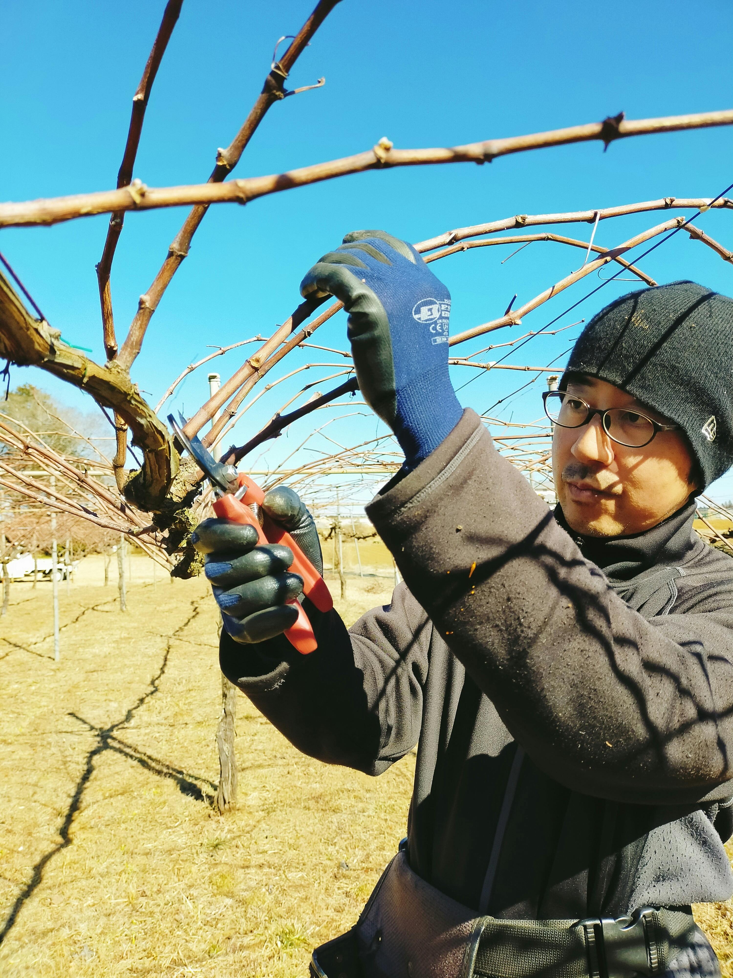 枝を落としてやることで、ぶどうの樹の上部にスペースが生まれ、作業がしやすくなるという訳です。