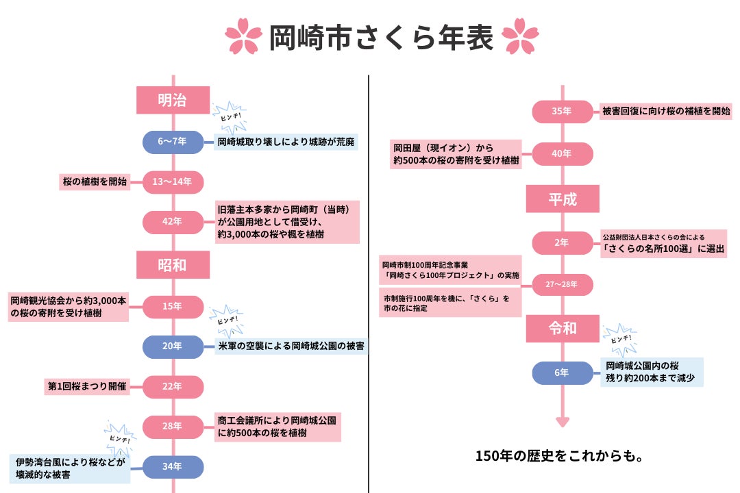 それ以来、市民をはじめ、市内外の企業や多くの協力者の支えを受けながら、岡崎市の桜の景観が築かれ、そして大切に守られてきました。