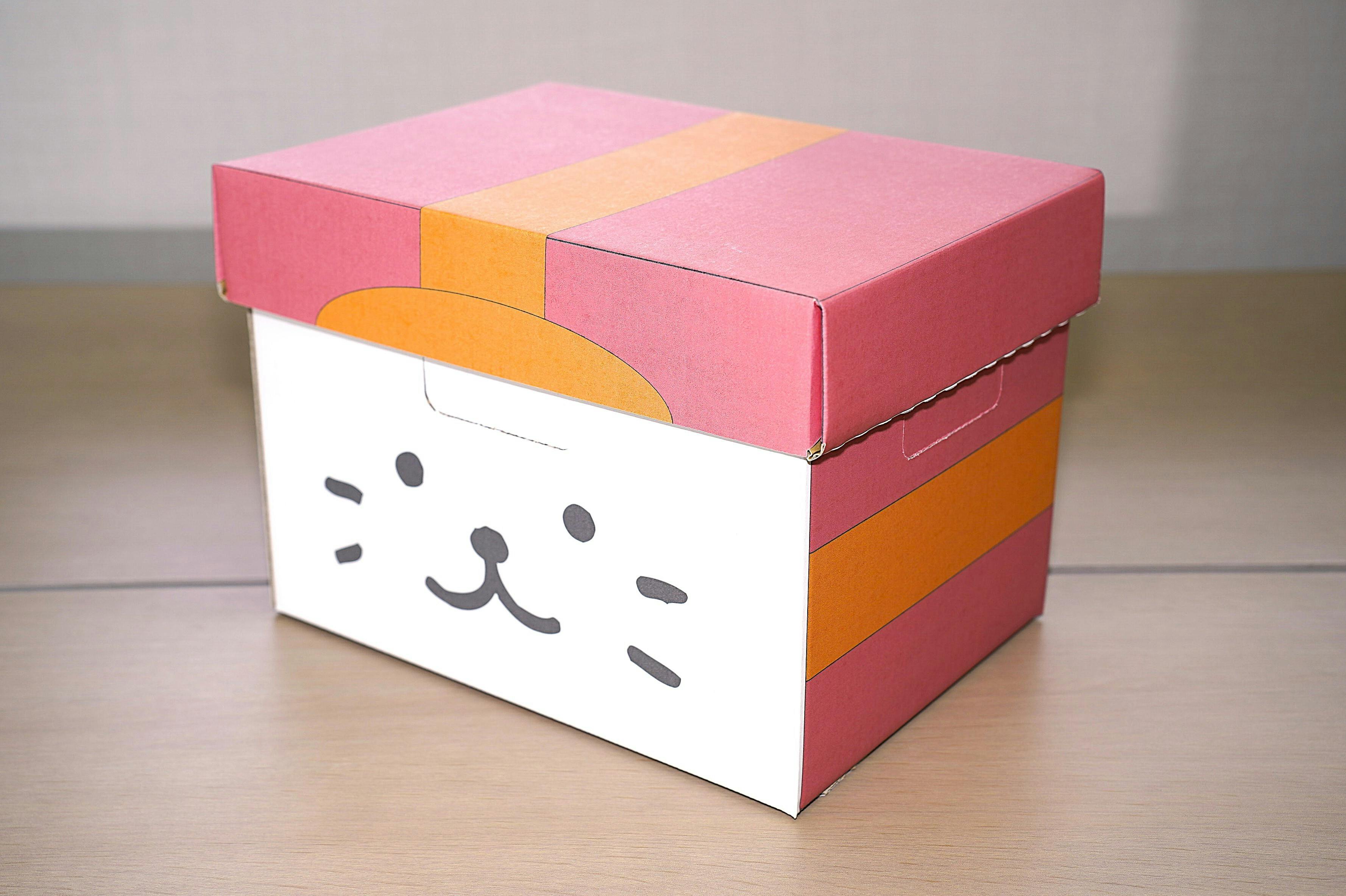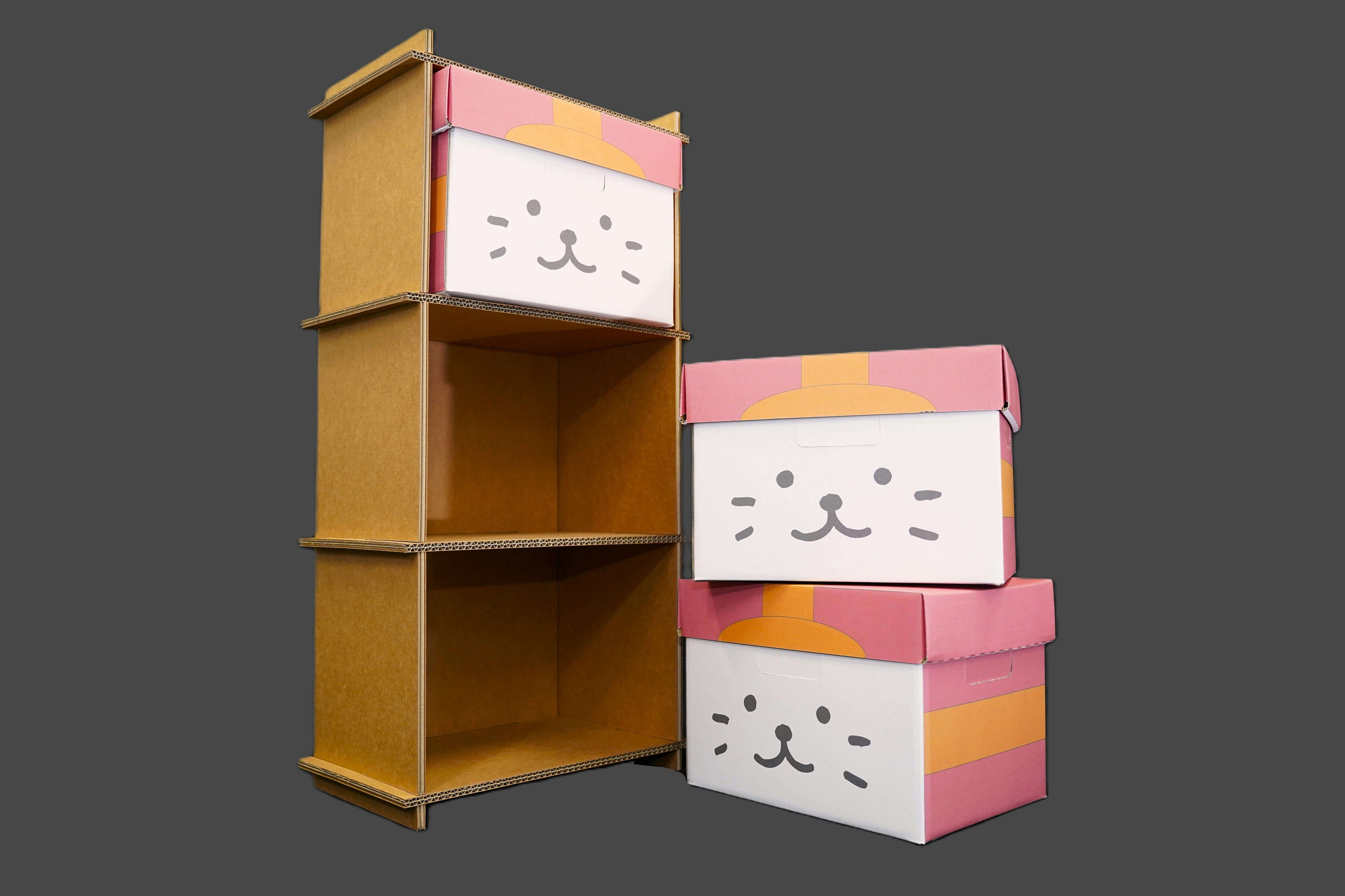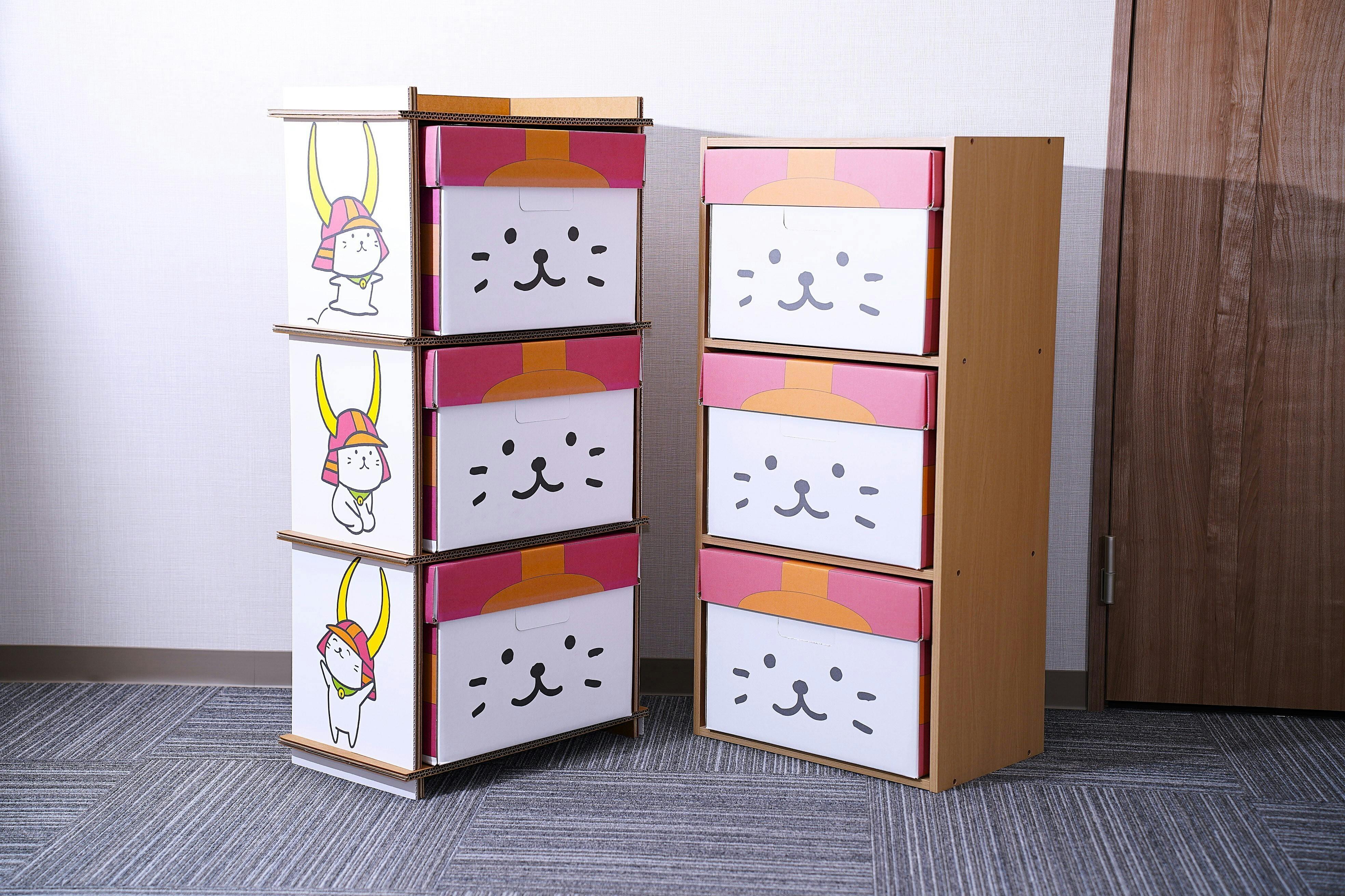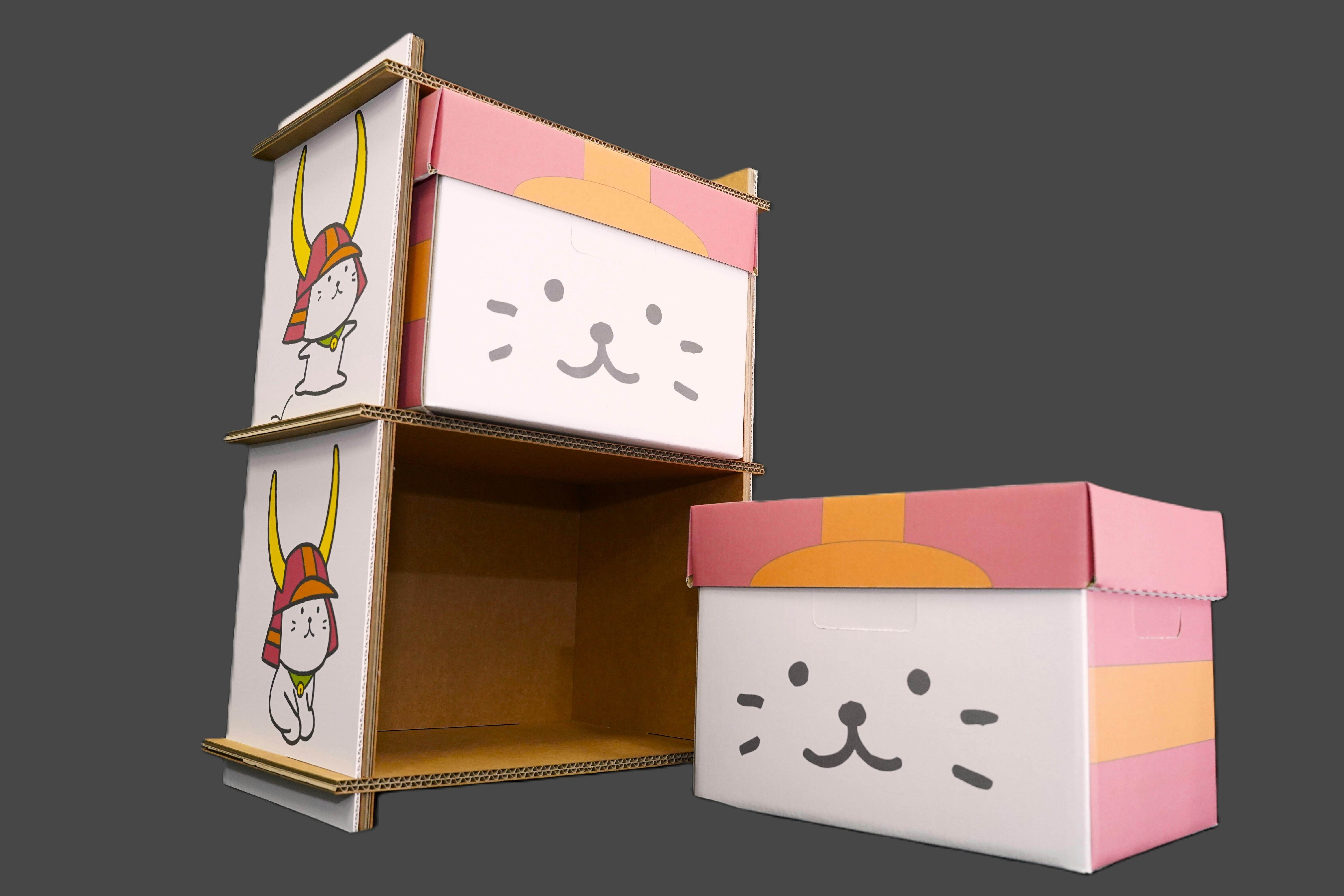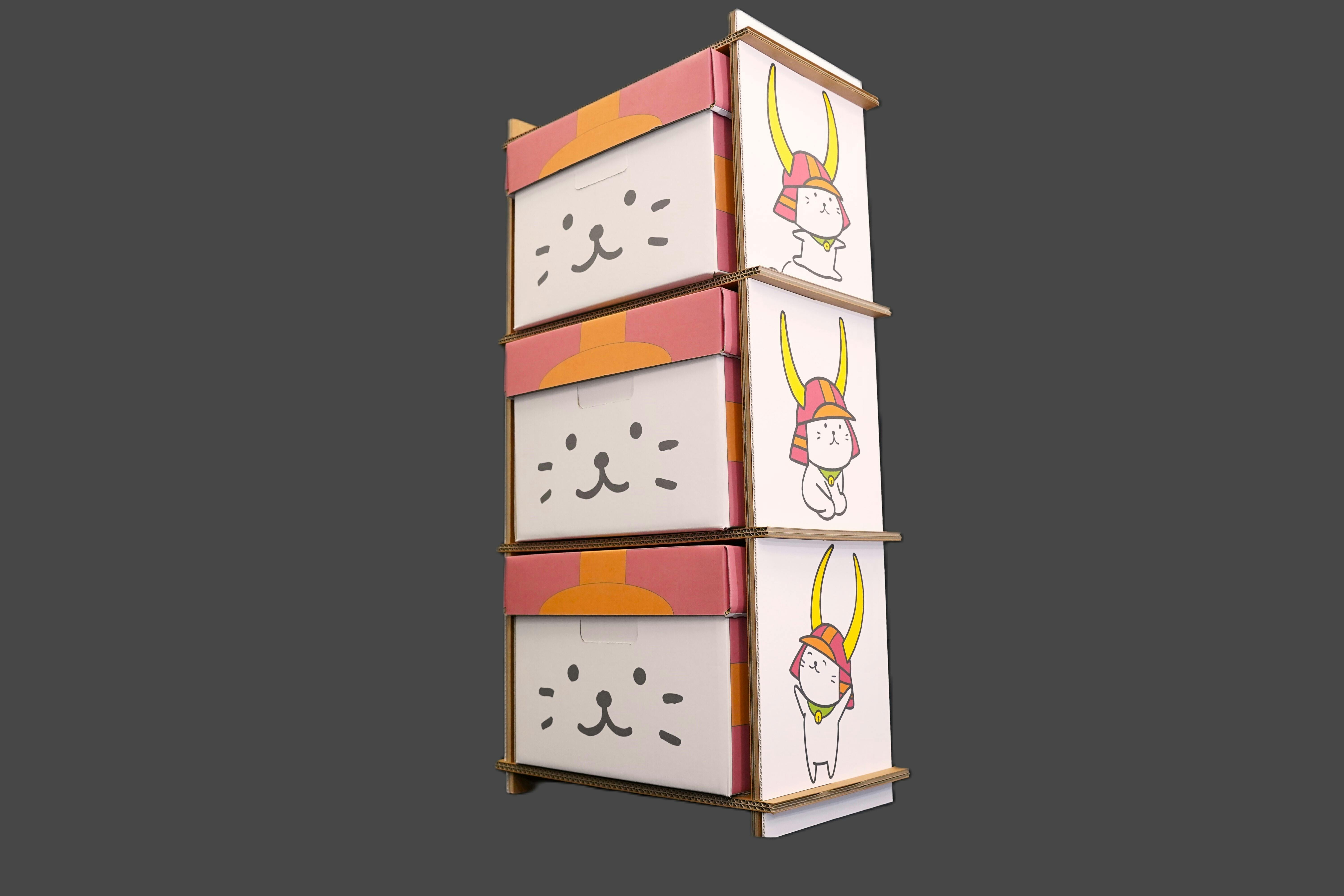 FaceBox「ひこにゃん」とセットで、弊社で以前から製造販売している強化ダンボール製のカラーボックスをセットにしてお届けします。組立には一切の工具は必要無し!こちらも3分で組み上がる超簡単仕様なのに、強度は一般販売のカラーボックスと遜色有りません。経年劣化して処分する際も環境にダメージを与えることが全く無い、最強のSDGs商品です!(※2段・3段ともに60セットまで)