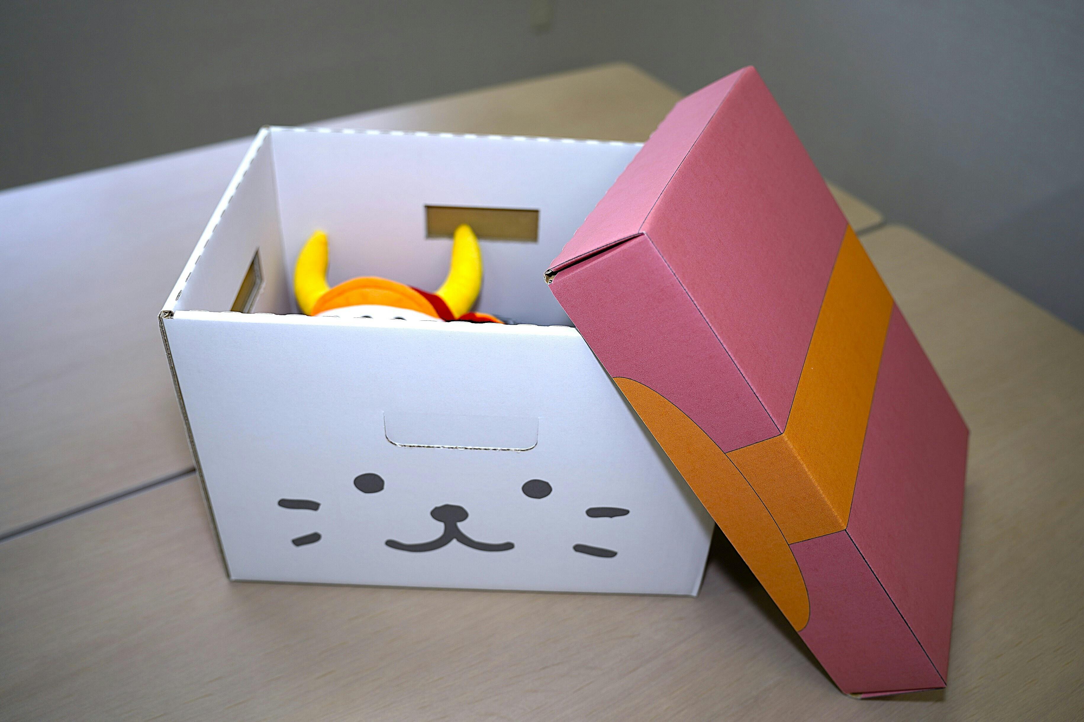 『滋賀県のゆるキャラ「ひこにゃん」を箱にしてしまおう!』というコンセプトを掲げ、そこから逆算して構造の設計をしていき、デザインを調整して、カラーボックスに対応したダンボール製インボックスとして完成させました。