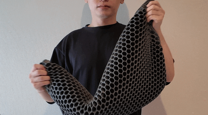 【バクの快眠まくら】のハニカム構造の素材のTPE(熱可塑性エラストマー)はゴムのように見えますが、実はプラスチックと同じ性質を持つ耐久性に優れた素材。
