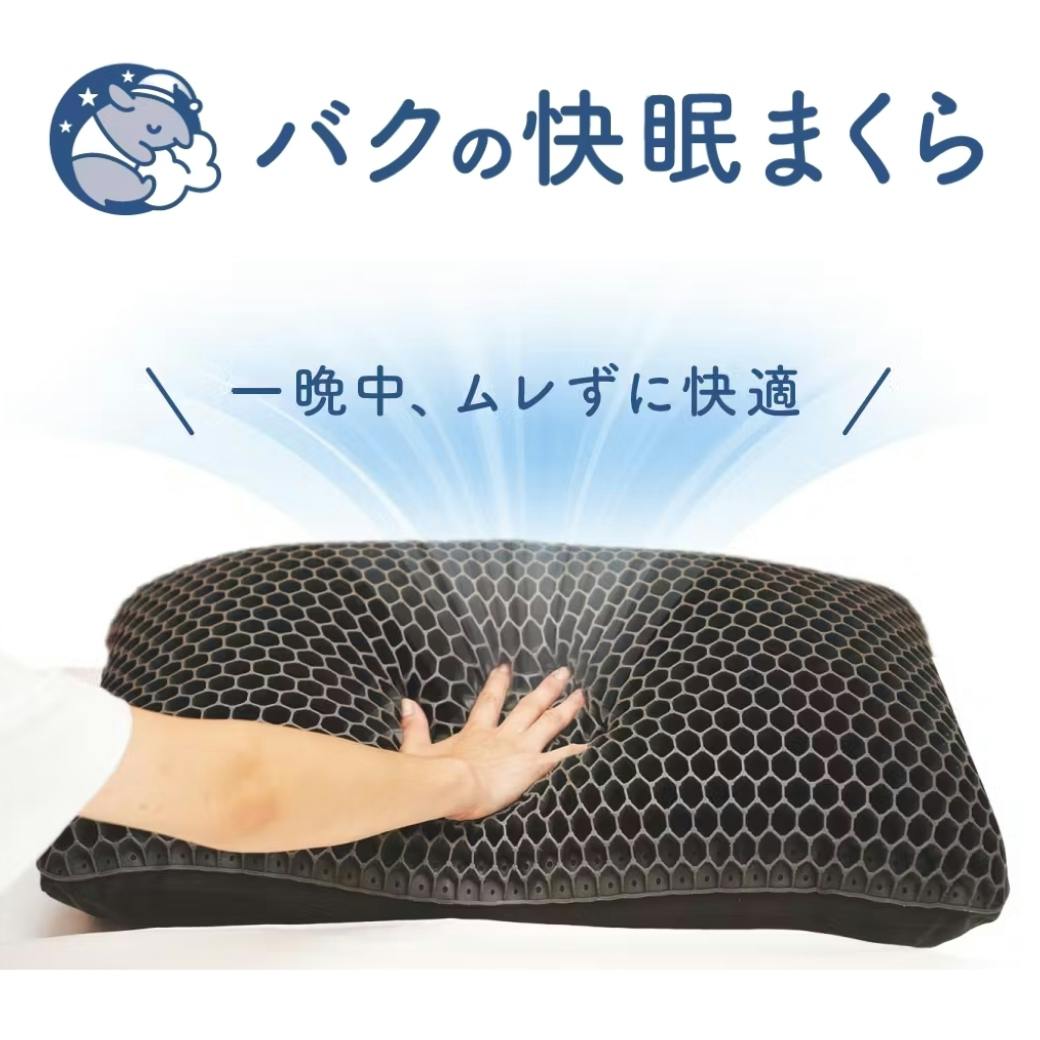 正六角形を隙間なく敷き詰めたハニカム構造の『バクの快眠まくら』。寝返りを打つたびに、枕にこもった熱や湿気を排出し、寝苦しさを解消します!