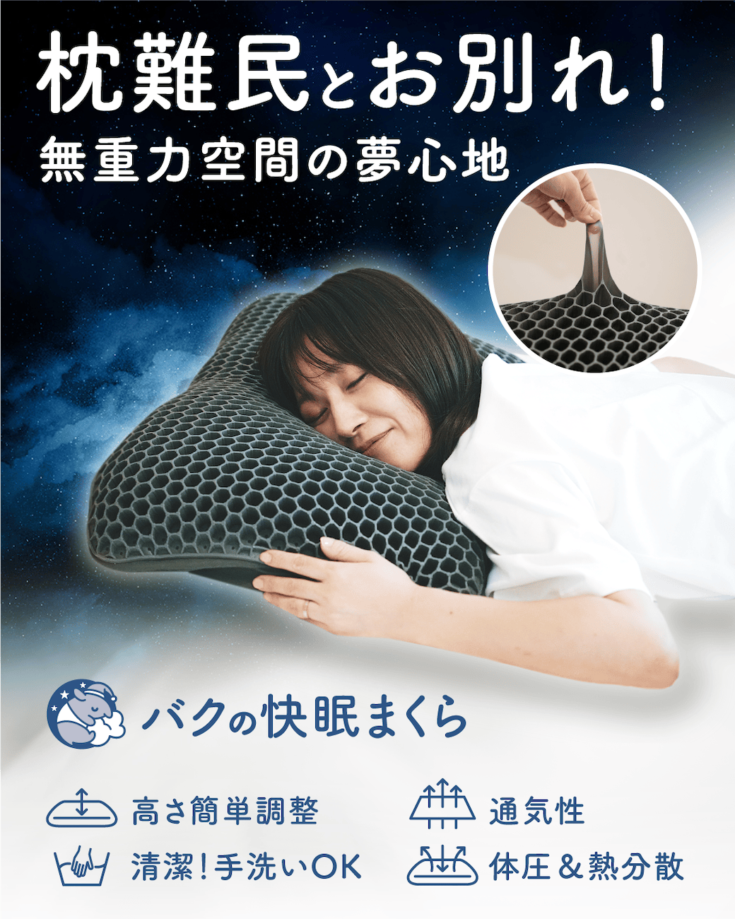 バクの快眠まくらは、しなやかなTPE素材とハニカム構造で、頭や首にかかる圧力を均一に分散。