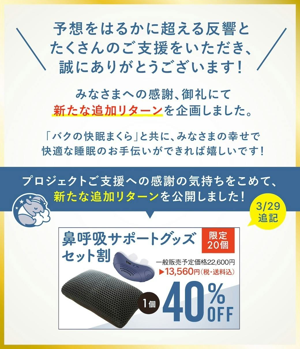 皆さまのおかげで、販売開始10分で、目標金額の10万円を達成することができました!大変ありがたいことに現在100名の方にご支援いただいております。本当にありがとうございます!そこで、感謝の気持ちを込めて、<3日間限定(14日~16日)>でご利用いただける、クーポンをご用意しました。https://camp-fire.jp/projects/812844/view?ctoken=VHeb2RXkZZ6MRjNxこの機会にぜひご利用ください☺︎\最大45%OFF/『バクの快眠まくら』で新感覚の“ふわっプニュ”体験を!