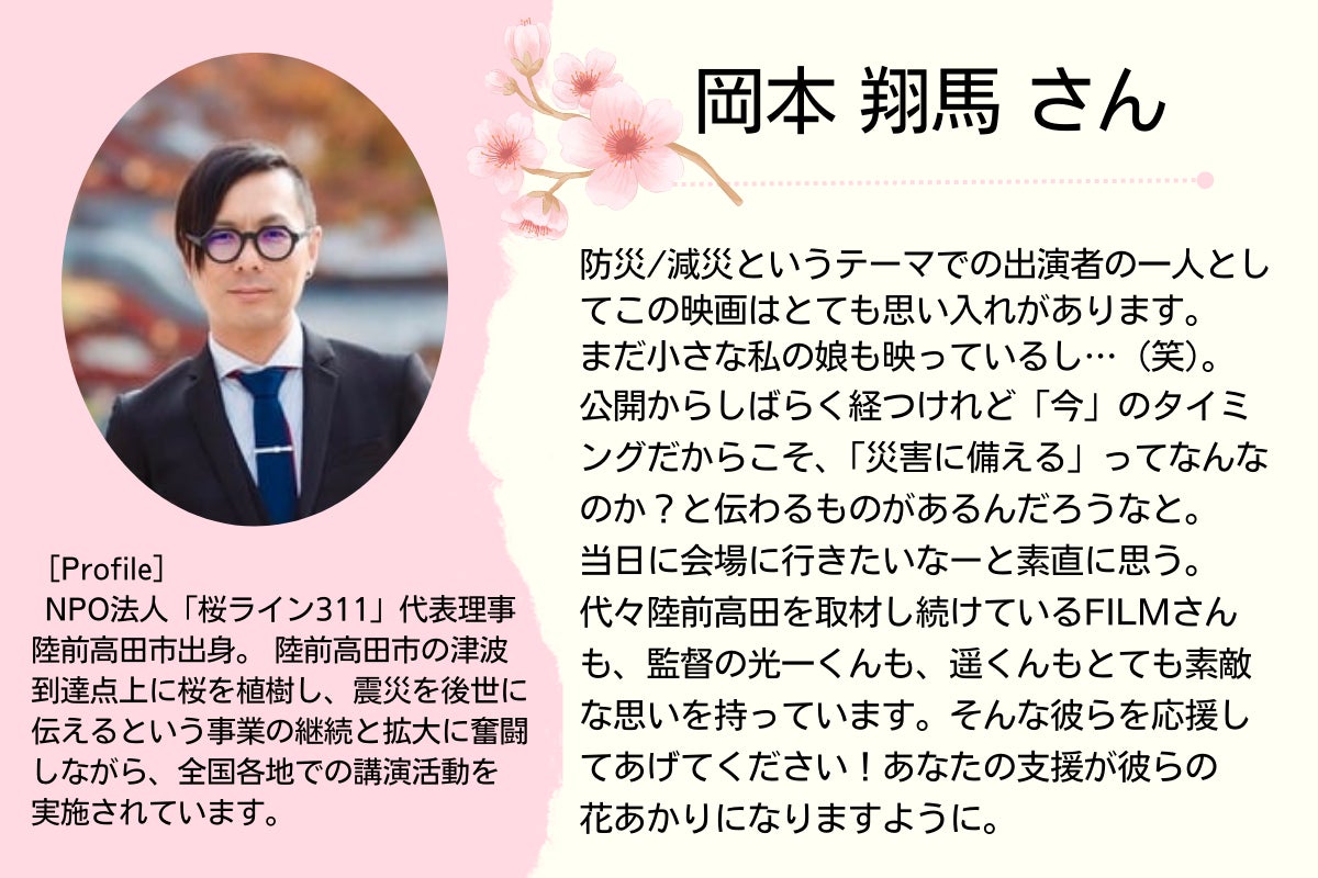 この上映会が、皆様にとって、「大切な人を守るために」という温かい気持ちで防災を考えるきっかけになれば嬉しいです。