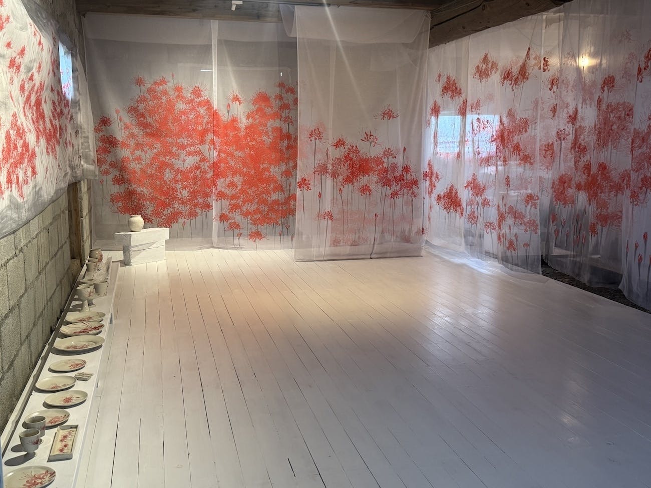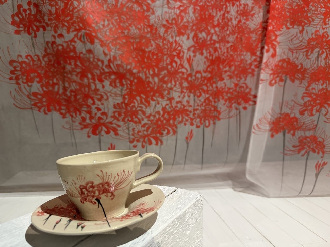 午前中は強風、そして雨。そんな空模様にも関わらず、お客様には静かな時間をゆっくり味わっていただけたようです。光によって見え方が変わる布絵。特に今日は、ライティングの陰影によって彼岸花の布画のマットな質感と器のツヤが際立ち、そのコントラストが鮮やかに映る瞬間があり、とても美しかったです。