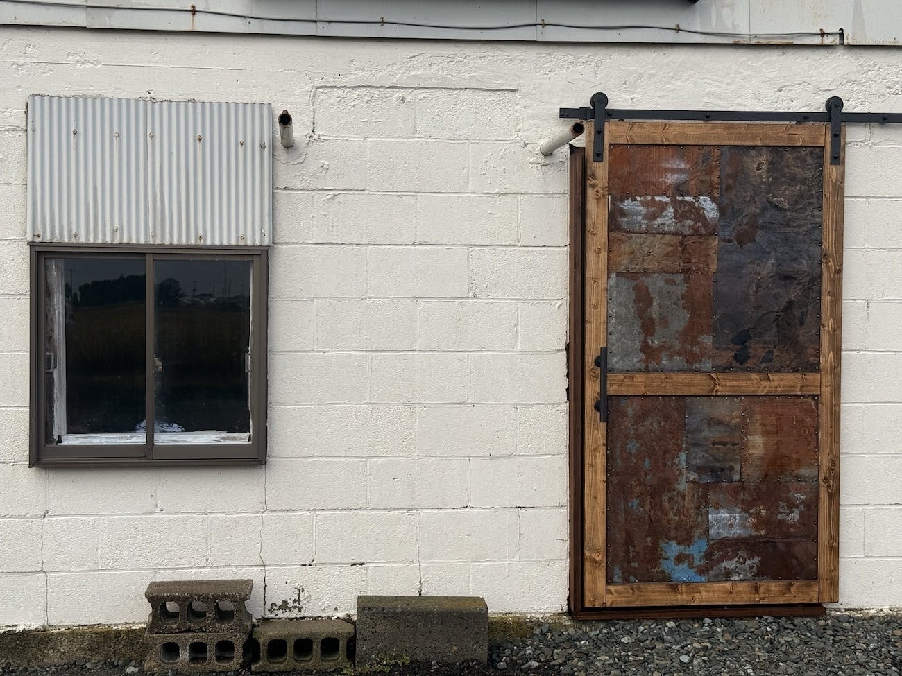 特注の扉は、貢さんの旧友・市川陸さんによるもの。古い錆の鉄板をパッチワークして時間の重なりを感じさせるデザインとしてお客様をお迎えします。