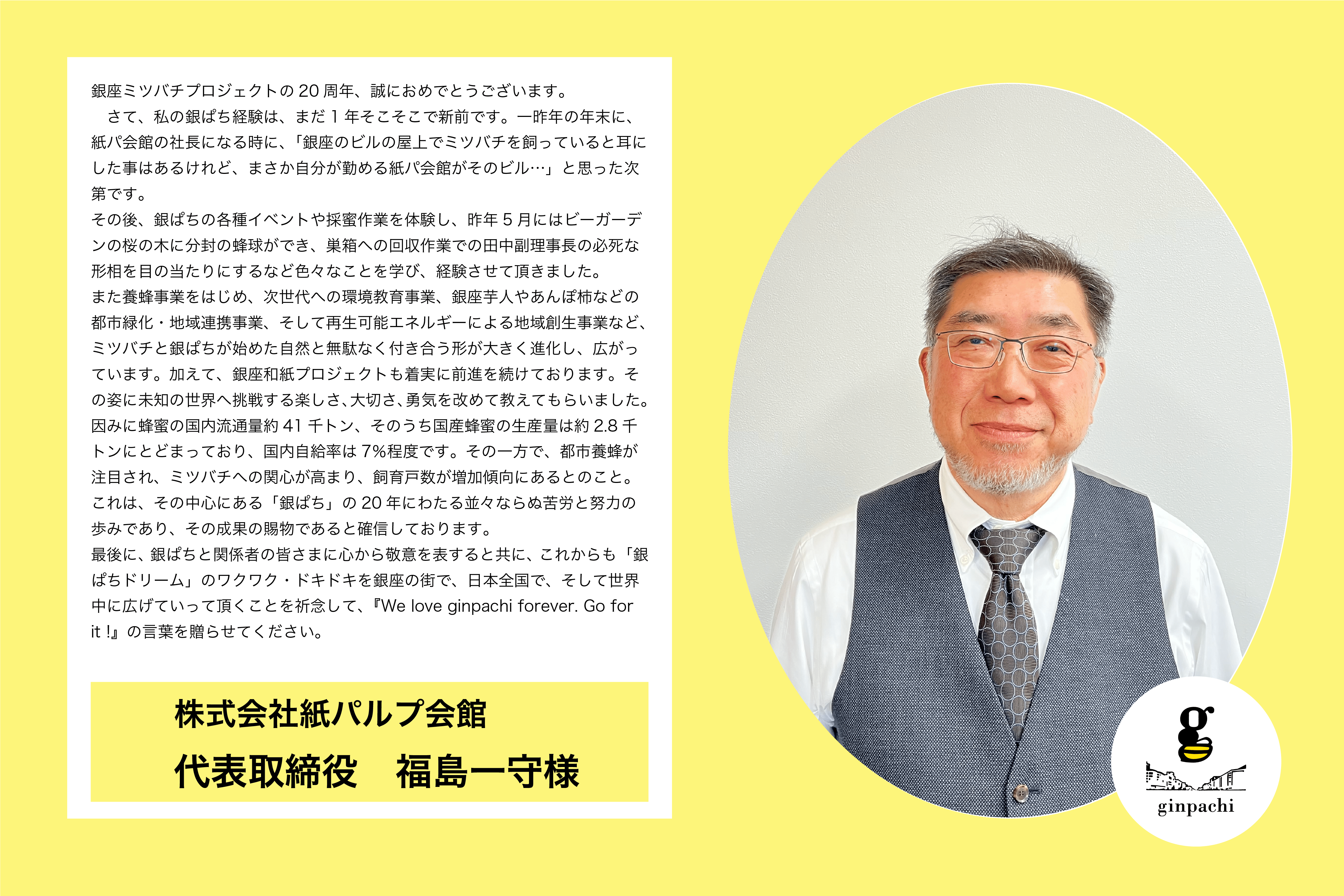 2025/03/27 10:22【応援メッセージ】株式会社紙パルプ会館 代表取締役 福島一守様銀座ミツバチプロジェクトの20周年、誠におめでとうございます。さて、私の銀ばち経験は、まだ1年そこそこで新前です。一昨年の年末に、紙パ会館の社長になる時に、「銀座のビルの屋上でミツバチを飼っていると耳にした事はあるけれど、まさか自分が勤める紙パ会館がそのビル・・」と思った次第です。その後、銀ぱちの各種イベントや採蜜作業を体験し、昨年5月にはビーガーデンの桜の木に分封の蜂球ができ、巣箱への回収作業での田中副理事長の必死な形相を目の当たりにするなど色々なことを学び、経験させて頂きました。また養蜂事業をはじめ、次世代への環境教育事業、銀座人やあんぽ柿などの都市緑化・地域連携事業、そして再生可能エネルギーによる地域創生事業など、ミツバチと銀ぱちが始めた自然と無駄なく付き合う形が大きく進化し、広がっています。加えて、銀座和紙プロジェクトも着実に前進を続けております。その姿に未知の世界へ挑戦する楽しさ、大切さ、勇気を改めて教えてもらいました。因みに蜂蜜の国内流通量約41千トン、そのうち国産蜂蜜の生産量は約2.8千トンにとどまっており、国内自給率は7%程度です。その一方で、都市養蜂が注目され、ミツバチへの関心が高まり、飼育戸数が増加傾向にあるとのこと。これは、その中心にある「銀ぱち」の20年にわたる並々ならぬ苦労と努力の歩みであり、その成果の賜物であると確しております。最後に、銀ぱちと関係者の皆さまに心から敬意を表すると共に、これからも「銀ばちドリーム」のワクワク・ドキドキを銀座の街で、日本全国で、そして世界中に広げていって頂くことを祈念して、「We love ginpachi forever. Go forit!」の言葉を贈らせてください。ーーーーーーーーーーーーーーーーーーーーーーーーーーーーーーーーーーー銀ぱちクラファン残すところあと2日です!!!引き続き応援よろしくお願いいたします。銀座ミツバチプロジェクト もっと見る