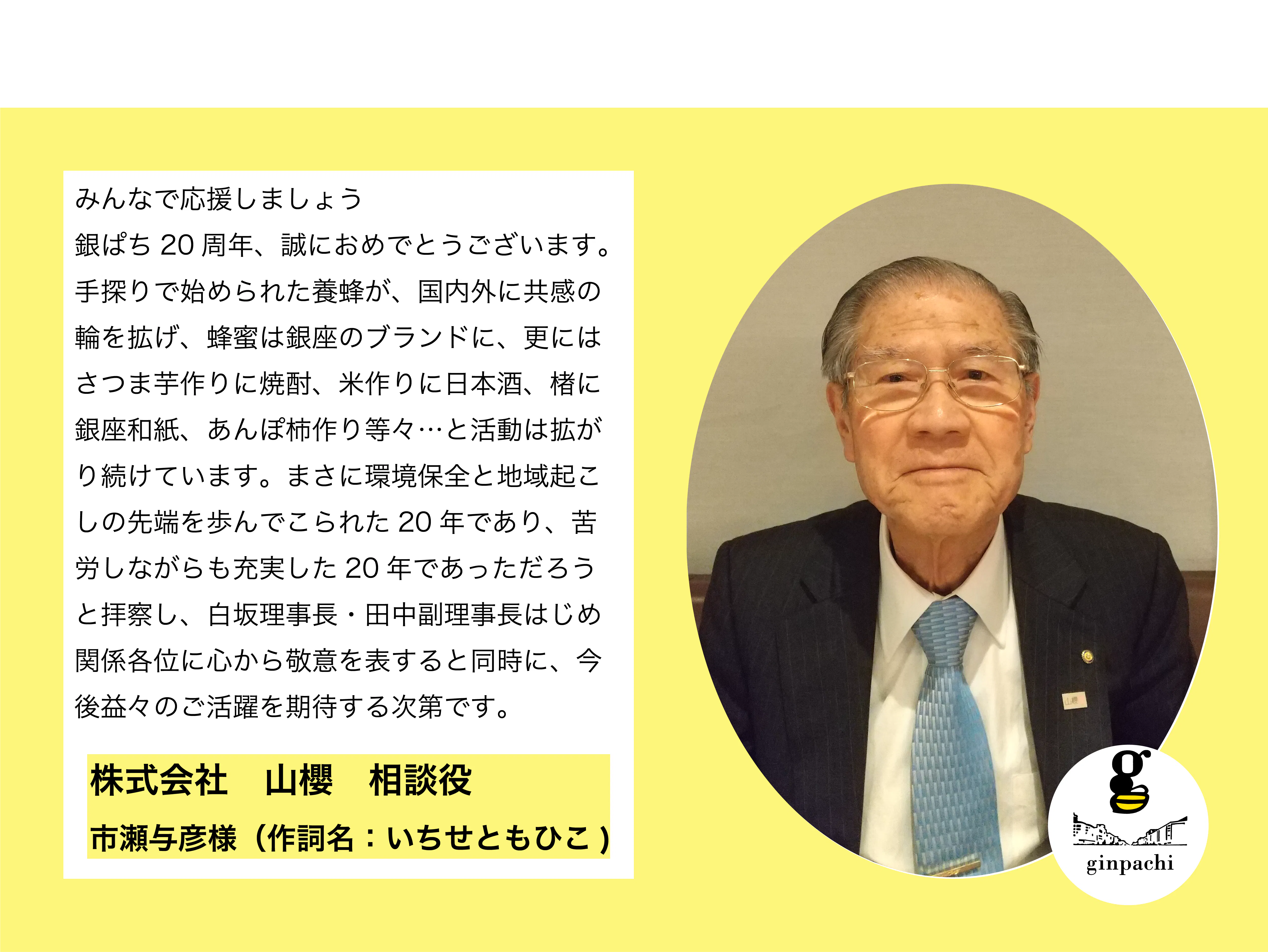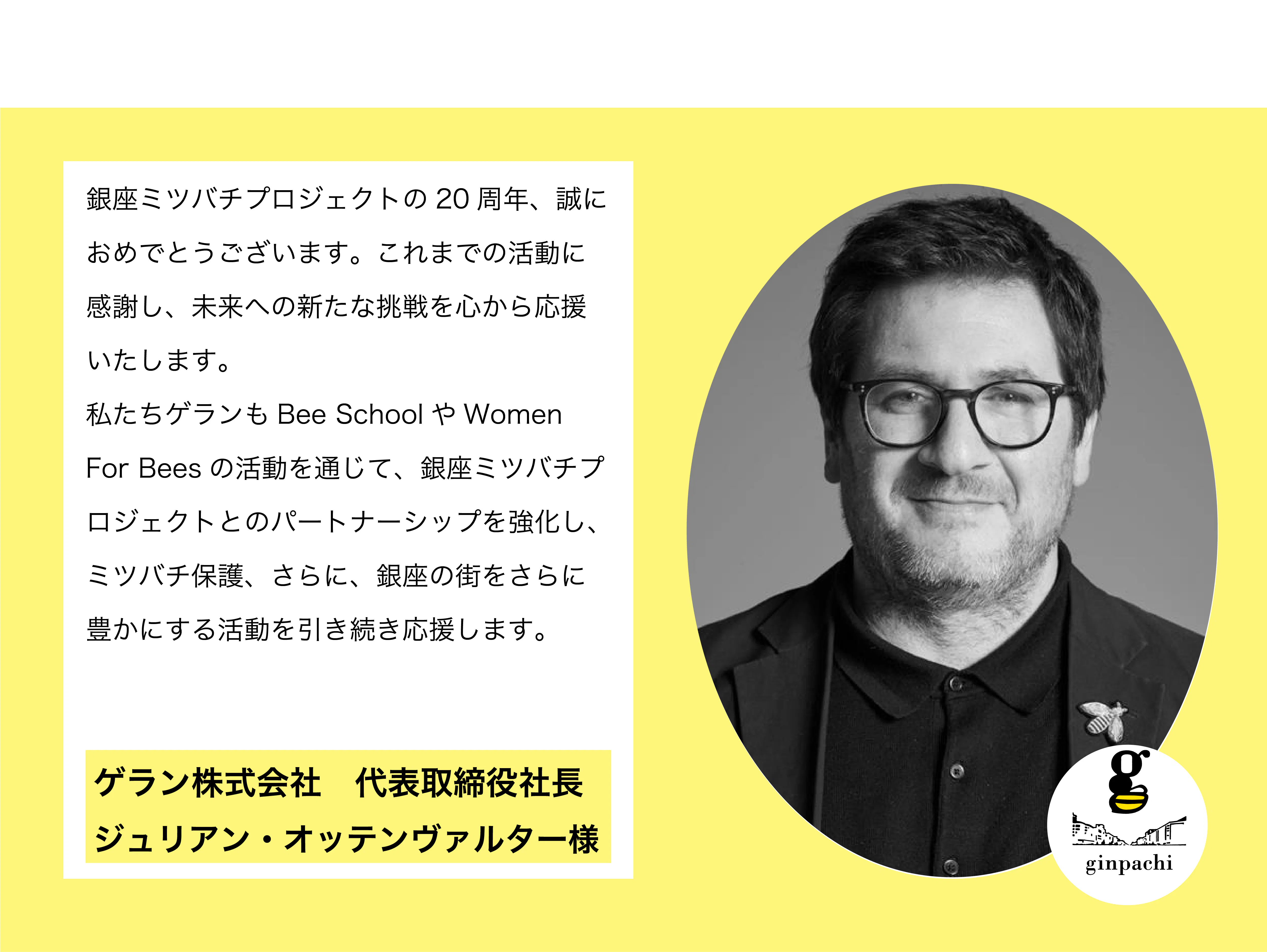 2025/03/27 10:22【応援メッセージ】株式会社紙パルプ会館 代表取締役 福島一守様銀座ミツバチプロジェクトの20周年、誠におめでとうございます。さて、私の銀ばち経験は、まだ1年そこそこで新前です。一昨年の年末に、紙パ会館の社長になる時に、「銀座のビルの屋上でミツバチを飼っていると耳にした事はあるけれど、まさか自分が勤める紙パ会館がそのビル・・」と思った次第です。その後、銀ぱちの各種イベントや採蜜作業を体験し、昨年5月にはビーガーデンの桜の木に分封の蜂球ができ、巣箱への回収作業での田中副理事長の必死な形相を目の当たりにするなど色々なことを学び、経験させて頂きました。また養蜂事業をはじめ、次世代への環境教育事業、銀座人やあんぽ柿などの都市緑化・地域連携事業、そして再生可能エネルギーによる地域創生事業など、ミツバチと銀ぱちが始めた自然と無駄なく付き合う形が大きく進化し、広がっています。加えて、銀座和紙プロジェクトも着実に前進を続けております。その姿に未知の世界へ挑戦する楽しさ、大切さ、勇気を改めて教えてもらいました。因みに蜂蜜の国内流通量約41千トン、そのうち国産蜂蜜の生産量は約2.8千トンにとどまっており、国内自給率は7%程度です。その一方で、都市養蜂が注目され、ミツバチへの関心が高まり、飼育戸数が増加傾向にあるとのこと。これは、その中心にある「銀ぱち」の20年にわたる並々ならぬ苦労と努力の歩みであり、その成果の賜物であると確しております。最後に、銀ぱちと関係者の皆さまに心から敬意を表すると共に、これからも「銀ばちドリーム」のワクワク・ドキドキを銀座の街で、日本全国で、そして世界中に広げていって頂くことを祈念して、「We love ginpachi forever. Go forit!」の言葉を贈らせてください。ーーーーーーーーーーーーーーーーーーーーーーーーーーーーーーーーーーー銀ぱちクラファン残すところあと2日です!!!引き続き応援よろしくお願いいたします。銀座ミツバチプロジェクト もっと見る