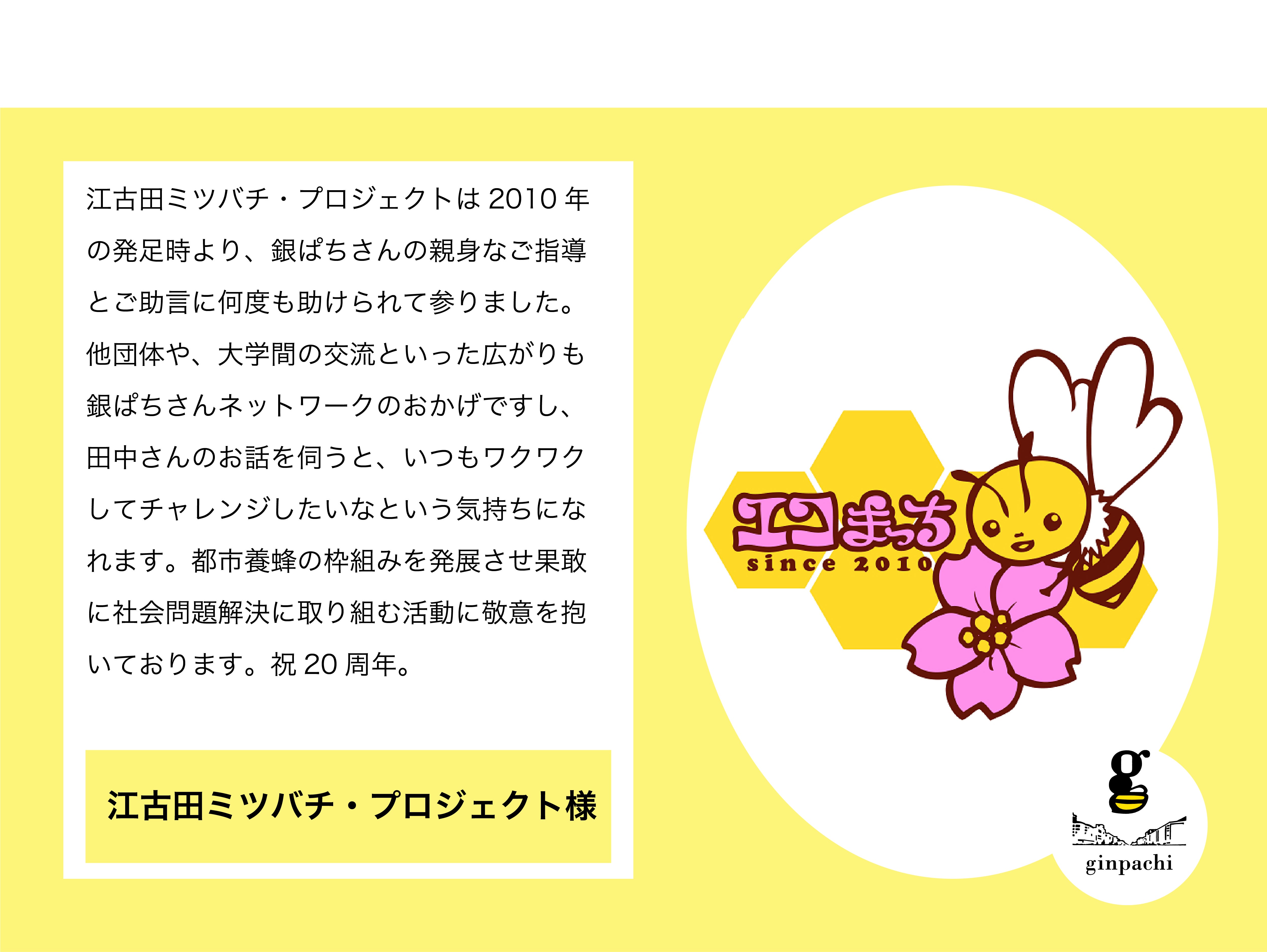 【応援メッセージ】非営利型株式会社宝塚すみれ発電 代表取締役 井上保子様銀座ミツバチプロジェクトを初めて訪れたのは 2019年のこと。ミツバチや蜂蜜の世界に触れることがこんなにも豊かな世界につながるとは思ってもみませんでした。銀座のビルの屋上から広がる農業(緑化)と畜産(ミツバチ)が多くの人たちを巻き込み、環境改善の一助となっています。この素晴らしき世界に宝塚も仲間入りさせていただき、持続可能な社会をともに作っていこうと思っています。ーーーーーーーーーーーーーーーーーーーーーーーーーーーーーーーーーーー引き続き応援よろしくお願いいたします。銀座ミツバチプロジェクト