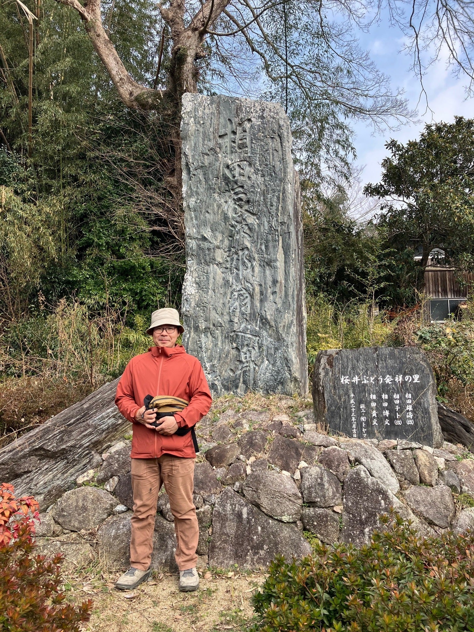 ↓ブドウ栽培担当スタッフと「桜井ぶどう発祥の里」石碑前にて。