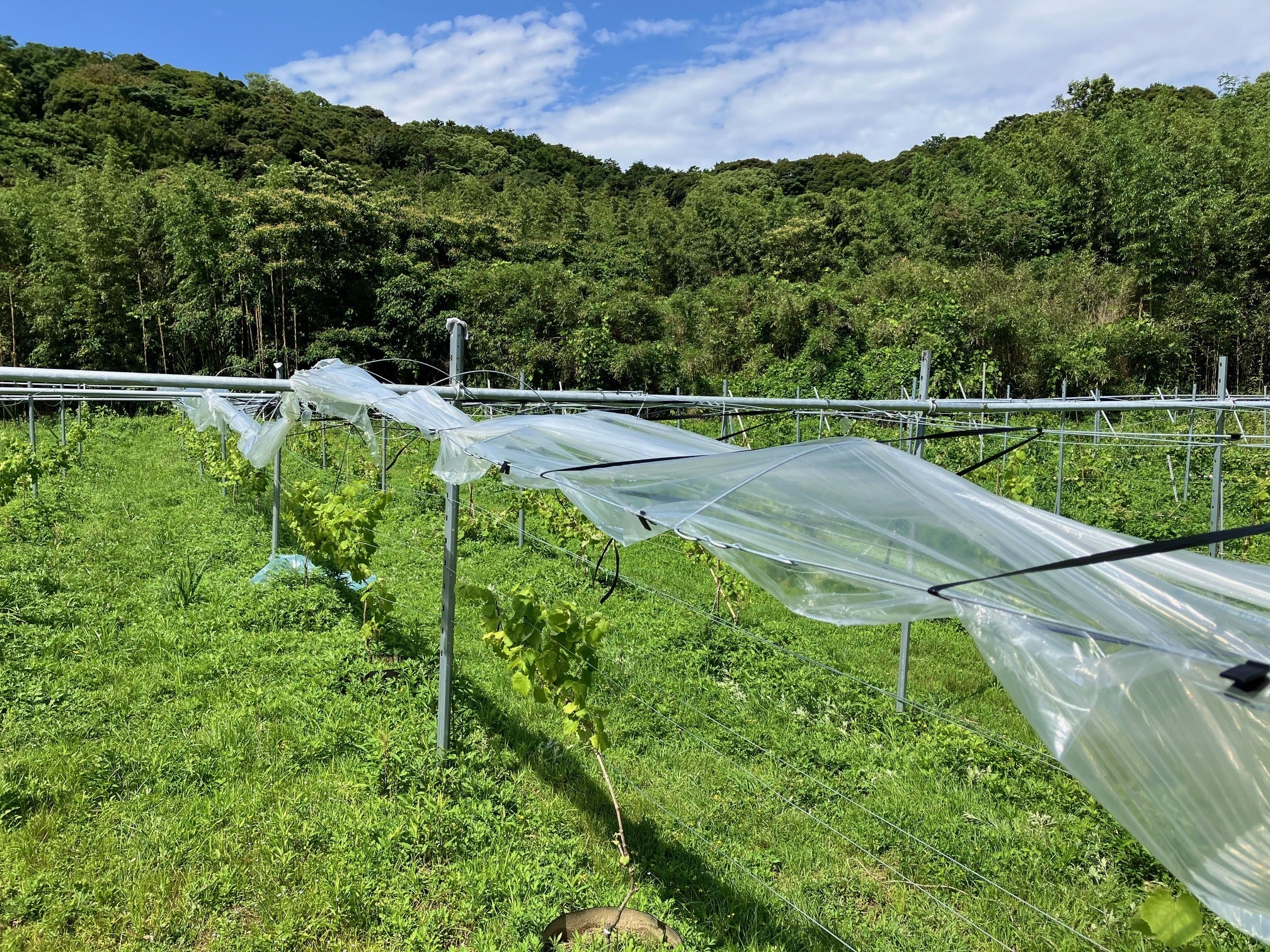 雨よけハウスは、雨を直接ブドウに当てないようにすることで病害の発生を抑え、農薬の使用量を減らすことも可能にするブドウ栽培にとって、とても重要な設備です。