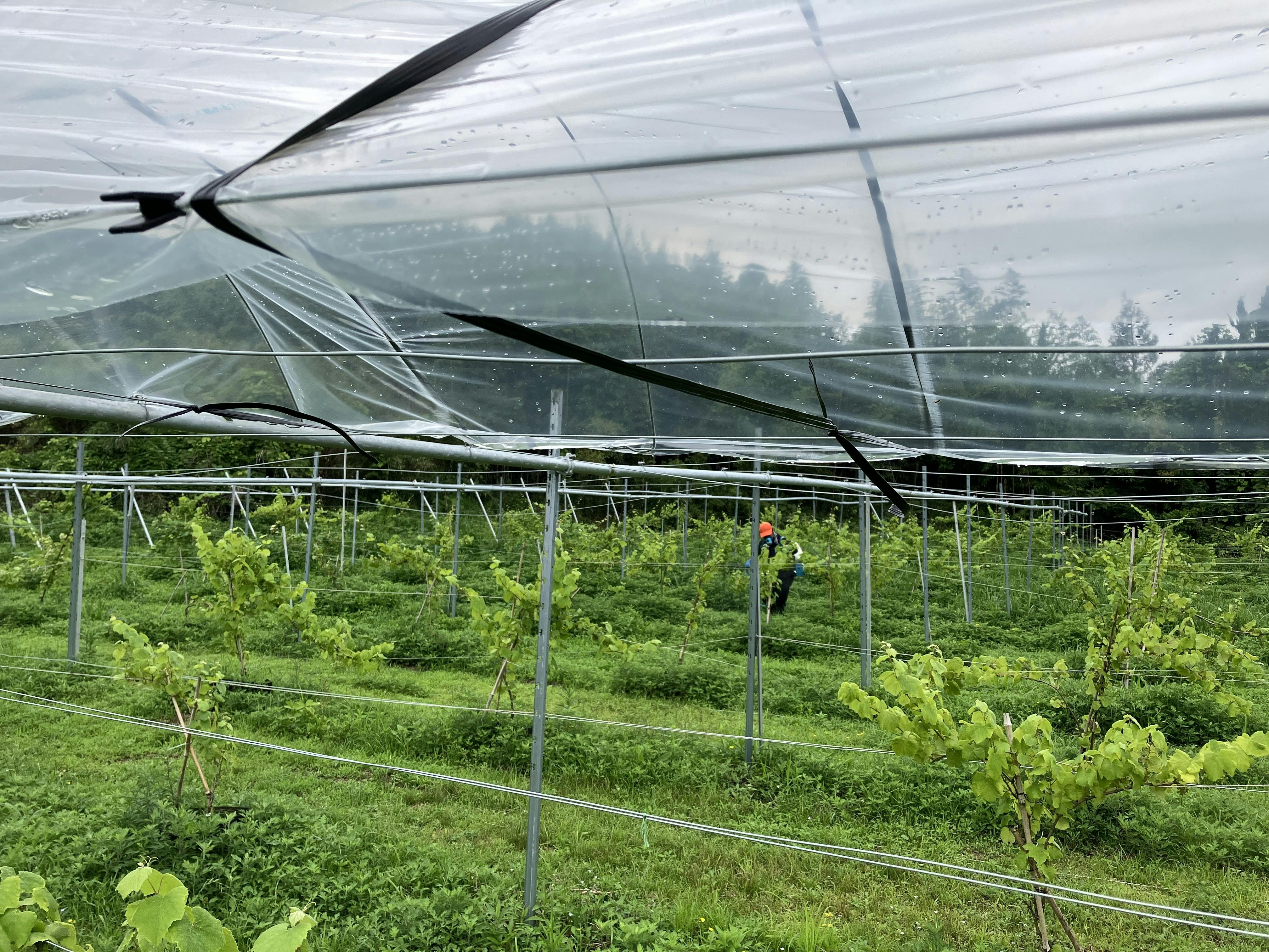 糸島は先週の土曜日頃から梅雨入りしててジメジメした天気が続いています。やはり病気も広がってしまいました。これ以上広がらないように、雨の切れ間で急いで防除をしました。やはり、雨除けのビニールが間に合っている場所のブドウの木は、目に見えて状態が良いです。早く全体を被せて元気に育てられるように。一歩ずつ、一歩ずつ、焦らず進めます。