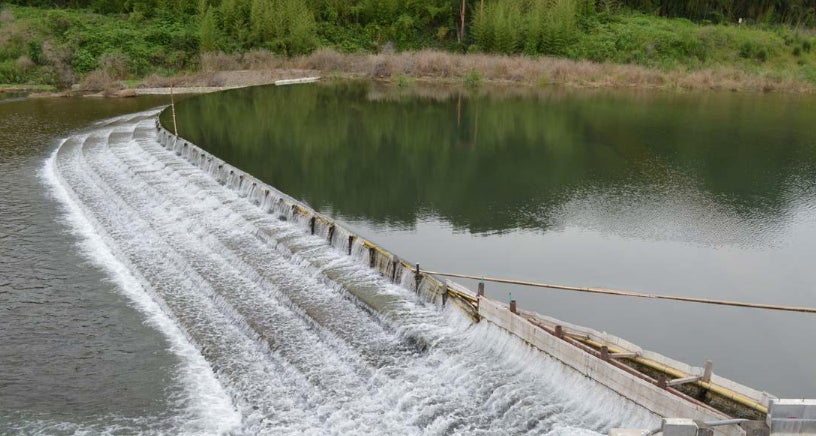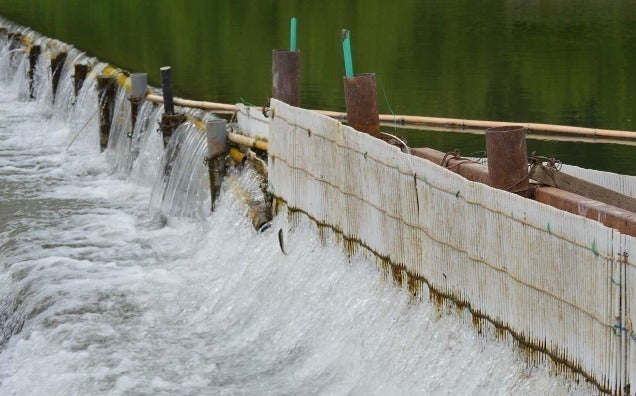 河川に人口的に小さな滝のような落差をつくり、水を引き込んで落ちて来るアユを竹組みのヤナの上で捕らえます。