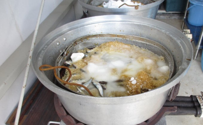 琵琶湖に繋がる清流の「天の川」のやなで朝一番にとれたあゆを選別して鍋に入れ、調味料「醤油」、「お酒」、「みりん」、「氷砂糖」、「ざらめ砂糖]で3時間余り、私たちが付きっ切りで火の加減をしながら炊きます。