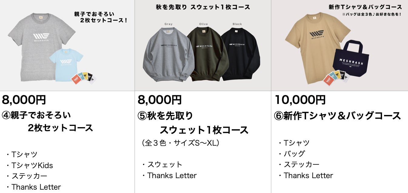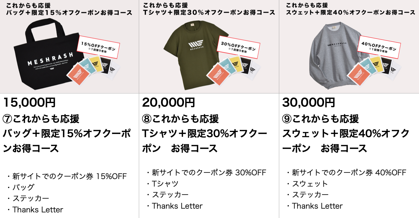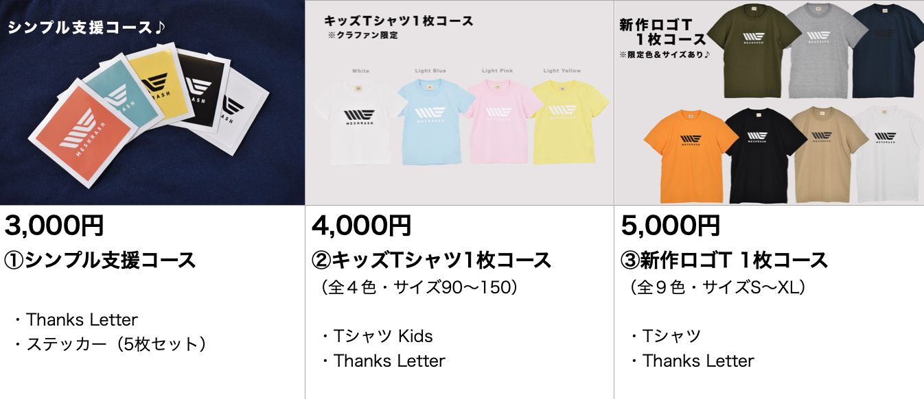 ※「このプロジェクトで実現したいこと」にも記載の通り、メシュラーシュの活動をしていくためには様々な費用が必要です。そのため、今回は「商品の割引販売」ではなく、「サポートをお願いしたい」という趣旨のもと、そのご支援のお礼に商品の一部をお届けするという形をとっています。その点ご理解いただき、1人でも多くの方にご協力いただけたら幸いです。
