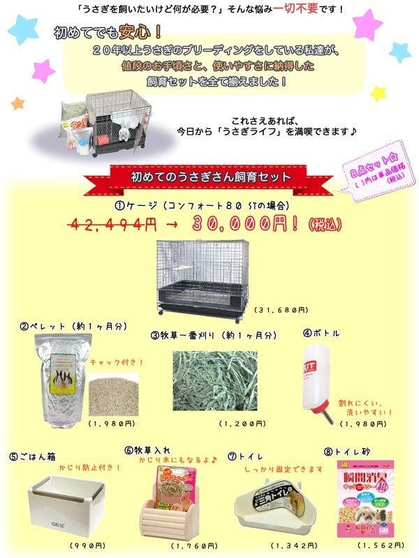空調、うさぎ用ゲージ、柵、芝 、30万円