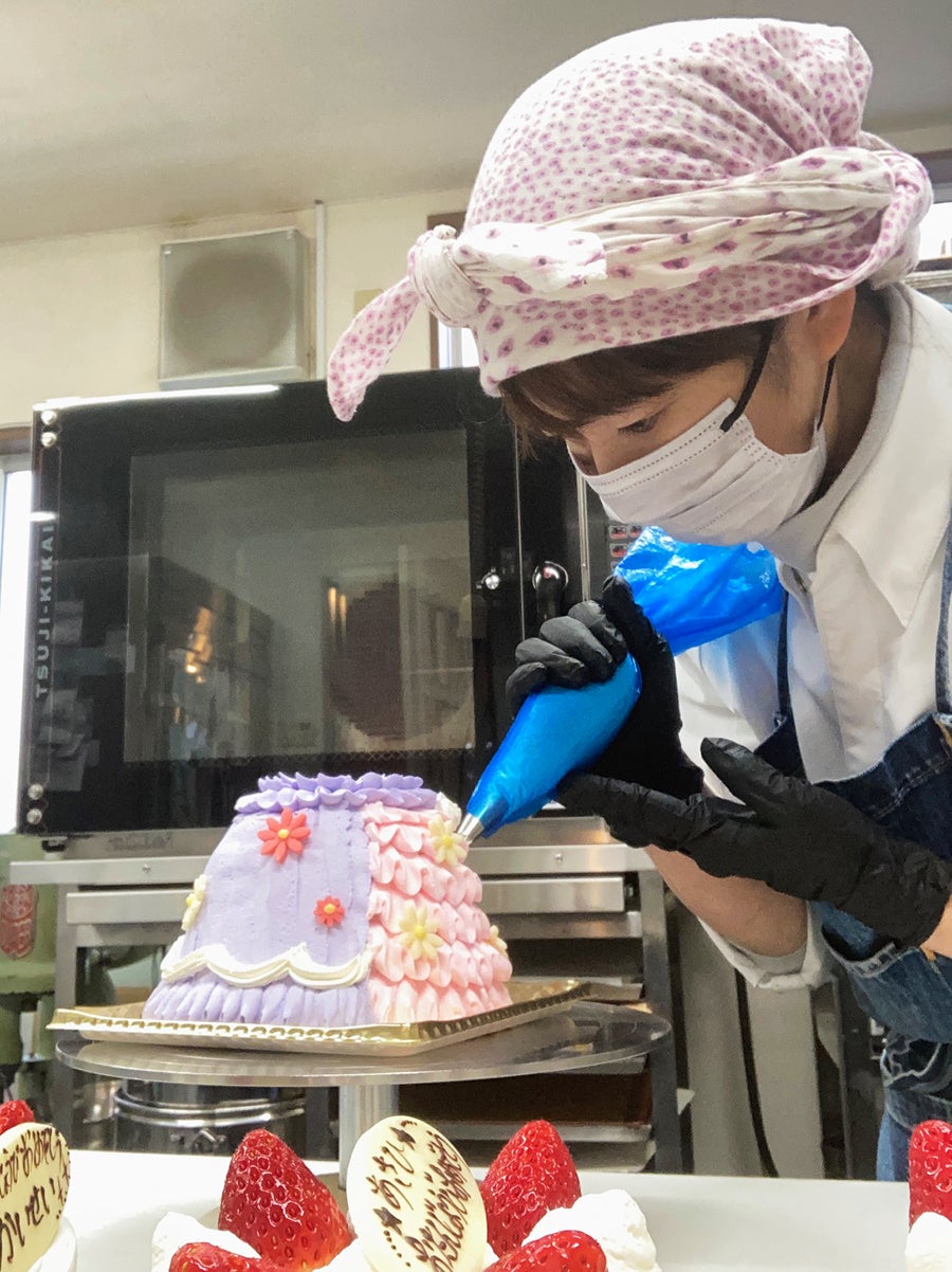 私が最初に就職した時代はお菓子作りの現場は男性がほとんどの時代、女性は足手まとい使えない、そもそも就職すら出来ない店舗も有りました。そこで、いつも「なに、くそっ!」と悔しい思いをしながら働いていた事を思い出します。わたくし自身は前に出る事が不得意の為、今までひたすら厨房にこもってお菓子を作り続けていたので、有名なお菓子のコンテストに出場したり、海外留学などには行きませんでした。ただ日々、お客様の大切な記念日のデコレーションケーキをご用意して大変感動して頂いたり、「この前買ったお菓子が美味しかったから、お友達にもあげたくて」とリピート頂くお客様とお話するとこちらまで暖かな気持ちと元気を貰えました。お菓子で人に感動を与えられる、そんな素晴らしい経験ができる事を趣味や仕事にしたい方々へ出来る限りご教授したいと願っております。