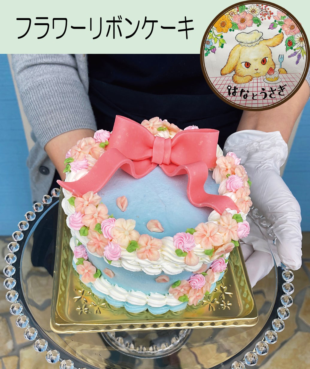 ↑クラファン限定デザイン【フラワーリボンのデコレーションケーキ】とお礼のメッセージ¥12000 4号サイズの苺サンドショートケーキ。天然色素使用バタフライピー等で色付けし、繊細なチョコレート細工のリボンとバタークリームの小花を飾ったデコレーションケーキです。冷凍保管で約14日お日持ち致します。また、お礼の手書きの御手紙をお送りします。