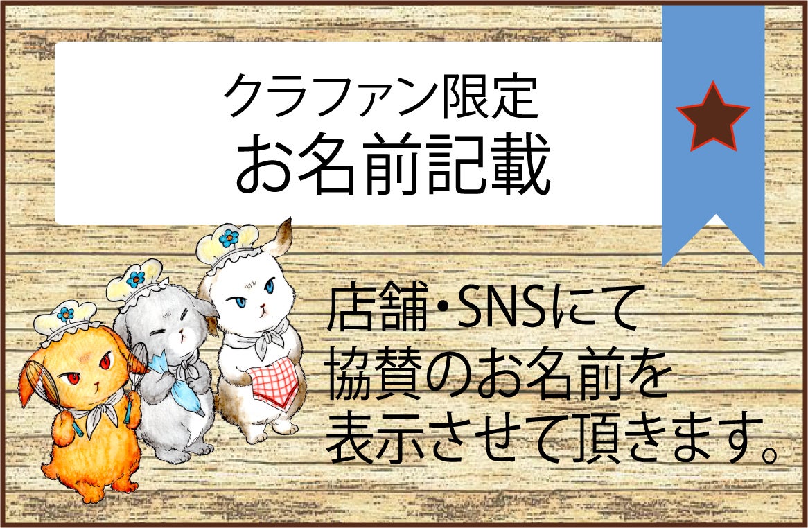 ↑クラファン限定特別権【お名前記載】¥30000 クラファンのみの特別限定権 【お名前記載】をご提供します。 はなとうさぎ店舗内レジ上の壁に、感謝を込めてご支援者様のお名前を記載させて頂きます。 また、SNSでも表示させて頂きます。