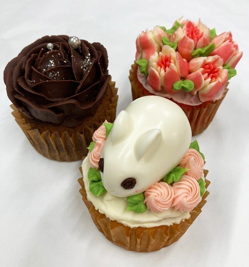 ↑【はなとうさぎ・スペシャルカップケーキ3個セット/お礼のメッセージ】 ¥7500 繊細でかわいい細工のカップケーキ3個入り。見た目も華やかな仕上がりになっていて、とてもお勧めです。また、お礼の手書きの御手紙をお送りします。