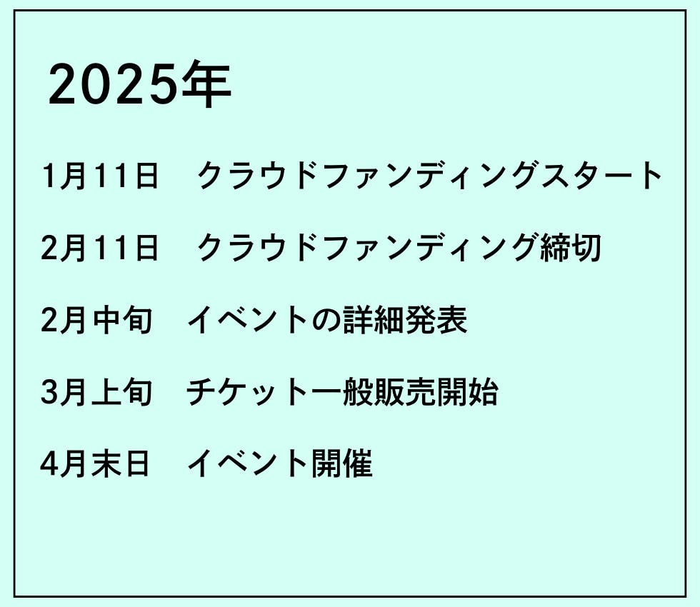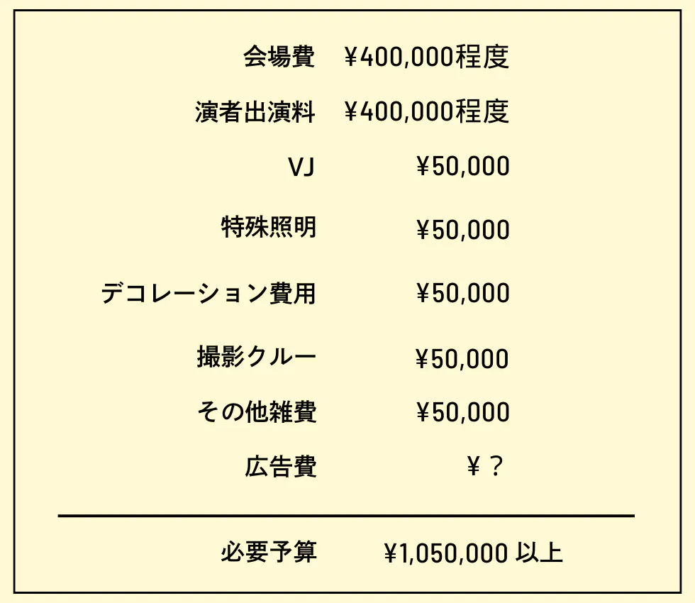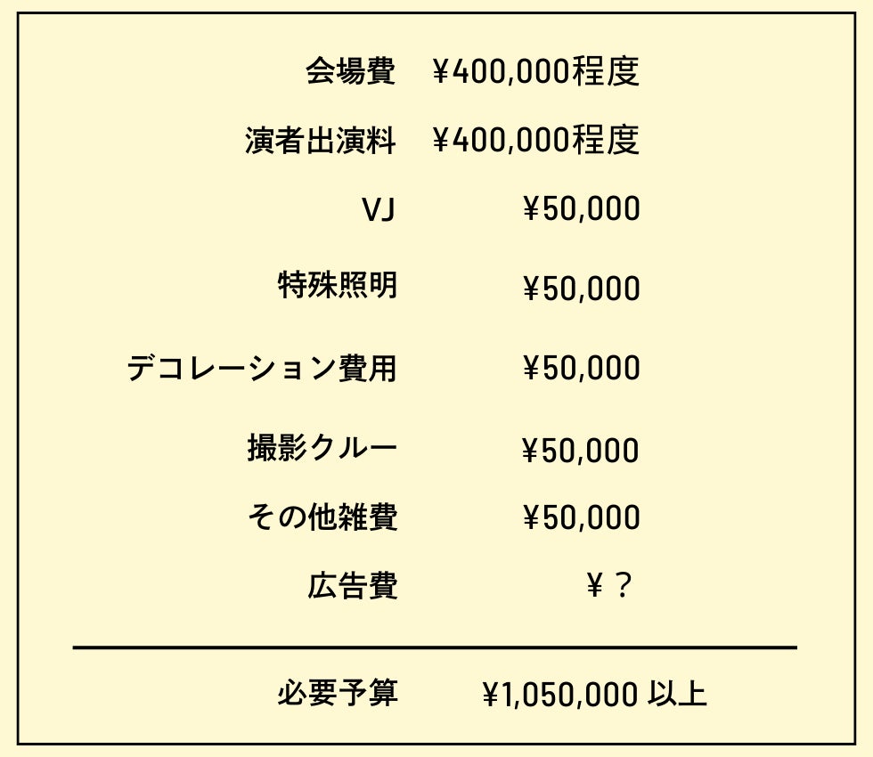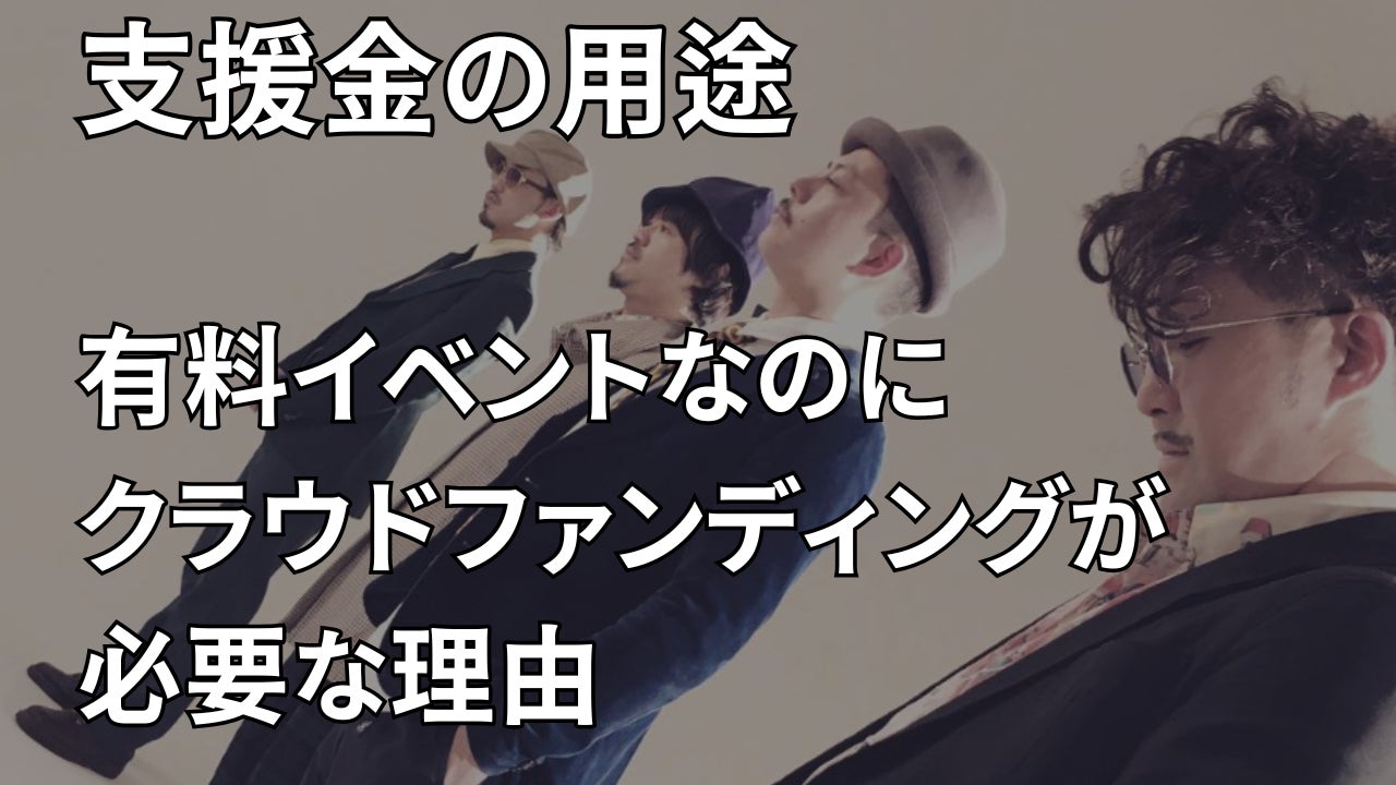 そして、前売りチケットの価格は4,000円を予定しており「250名様のご来場」にて、ギリギリ赤字がないイメージでしょうか。今回の支援金目標は50万円で計画しており、皆様のお力を借りてイベント予算の半分を確保できれば、非常に余裕を持った集客プランを立てられると考えております。