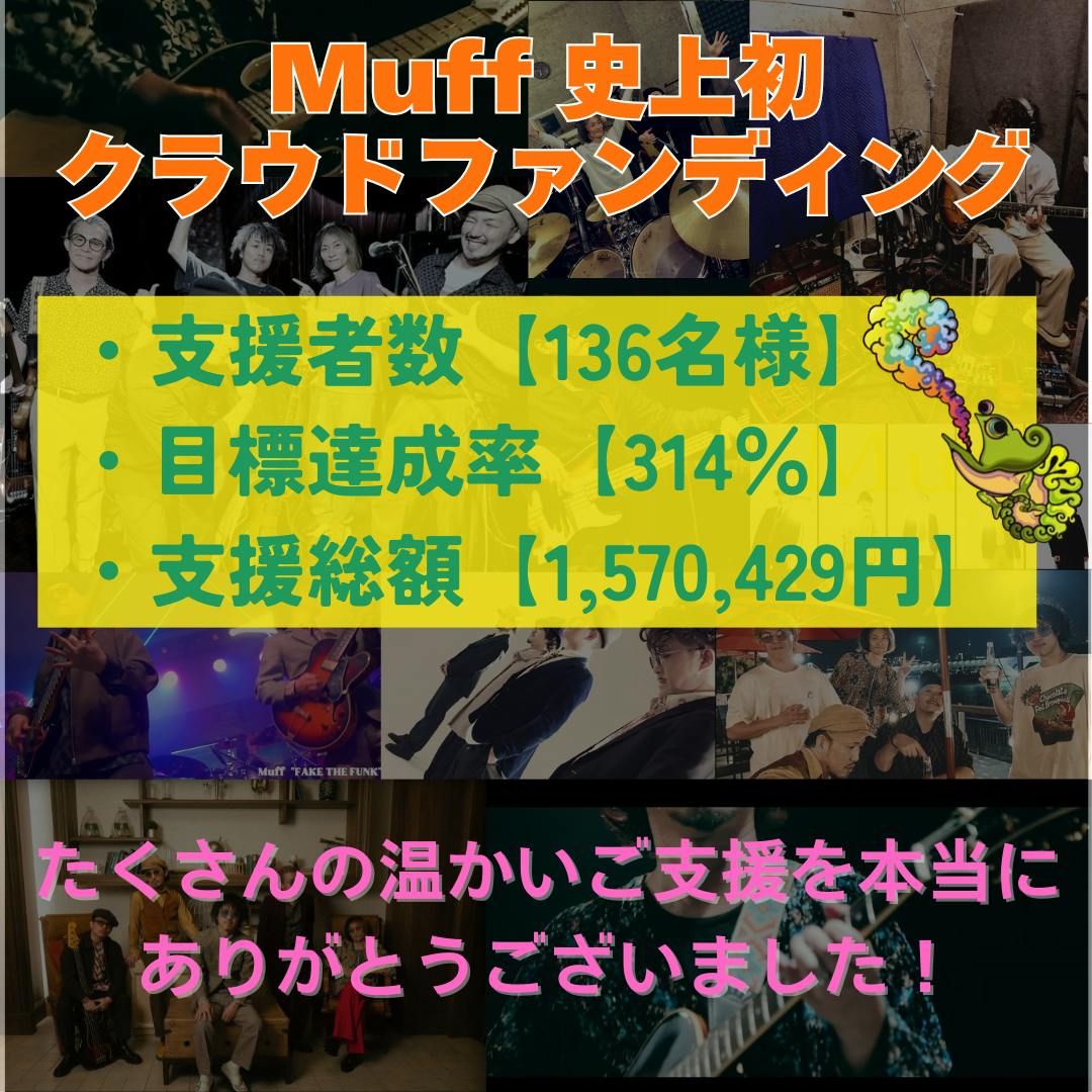 2025/02/21 11:07【クラウドファンディング終了!】2025年2月11日23:59をもってMuff史上初のクラウドファンディング「30歳以上限定:オトナの極上クラブイベント」のご支援受付を終了しました!そして最終日2/11には、公式Muff Chanelにて、初のYouTube LIVEも実現!イベントはこれからですが改めて、「Muffは本当に多くの方の応援によって支えて頂いている」という現実を強く実感する事となりました。応援してくださった皆様には、本当に感謝しかございません。現在はイベント準備と共に、リターンご提供の準備を整えております。今しばらくリターンのお届けをお待ち頂けましたら幸いです。そして改めてになりますが、今回のクラウドファンディングの最終結果についてご報告致します。******************1月11日「クラファン開始」-目標達成!-1月15日「達成率100%目標額50万円を突破!」-ストレッチゴール達成!-2月05日「達成率200%目標額100万円を突破!」2月11日 最終日・支援者数【136名様】・目標達成率【314%】・支援総額【1,570,429円】******************皆様のおかげで大成功で終える事ができました!!Muffクラウドファンディング企画をたくさん応援して頂き、本当に、本当にありがとうございます!Muffはまだまだこれからも、皆様に極上の音と空間を届けられるバンドアーティストとして前進を続けます。改めて、「30歳以上限定:オトナの極上クラブイベント」こと【音浴-ONYOKU-】を、歴史に残るクラブイベントとして、記憶に刻まれるカルチャーとして、憧れと喜びを感じてもらえる体験として、Muff史上最高のイベントにできるように尽力致しますので、引き続き宜しくお願い致します。Muff一同※リターンのお届けについては、後日メールにてご連絡させて頂きますので、CAMPFIREに登録してあるメールアドレスの確認をお願いします。 もっと見る