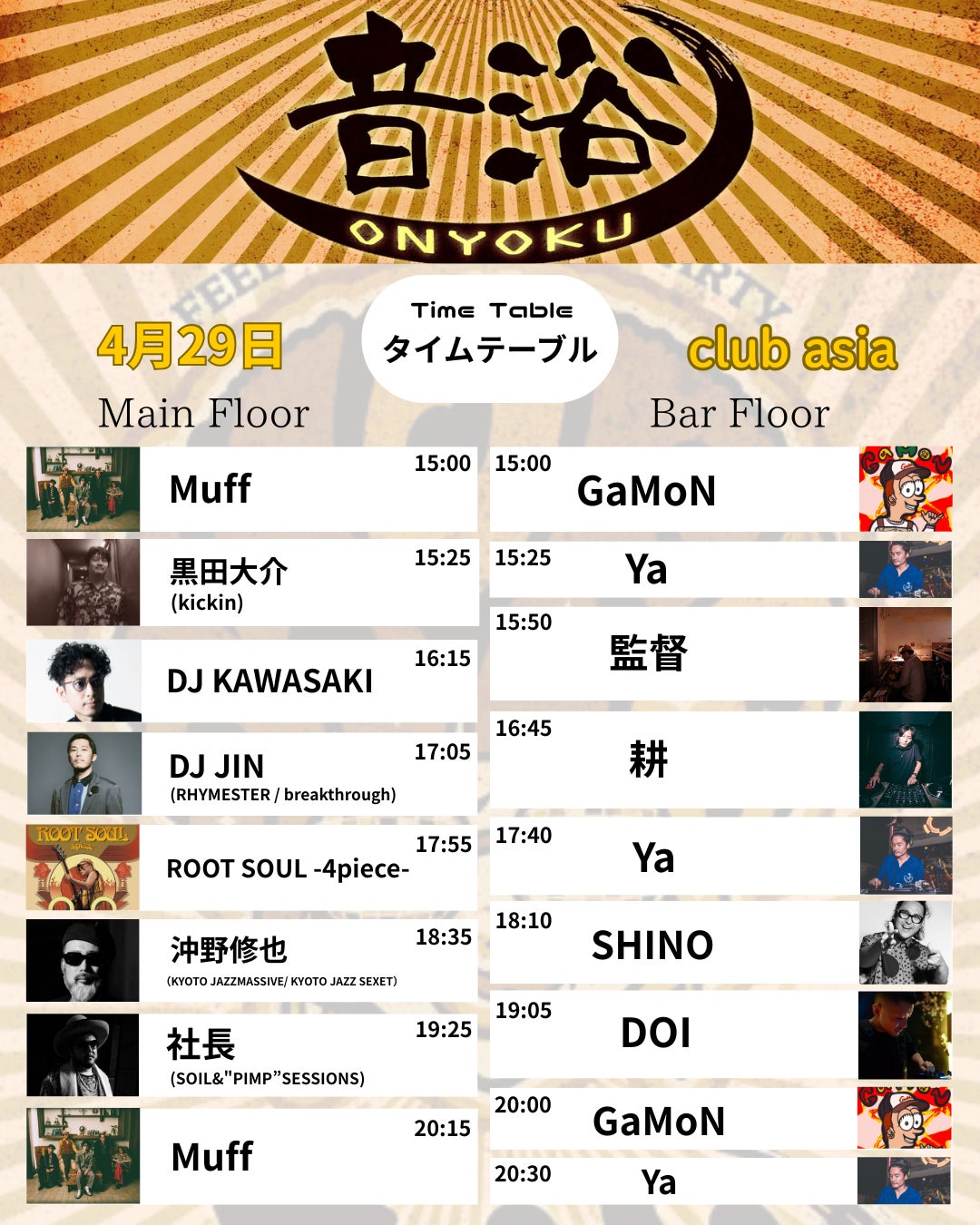 さて、それでは皆様の温かいご支援により実現致しました、珠玉の出演アーティスト達をタイムテーブルと合わせ、改めてご紹介致します!!