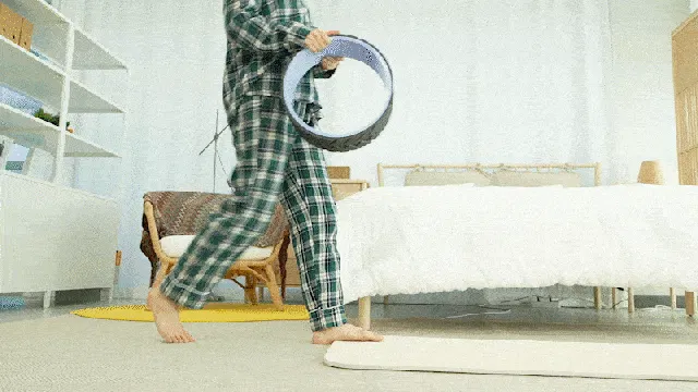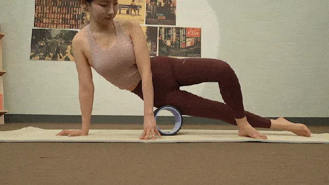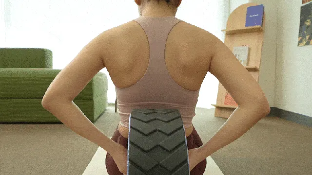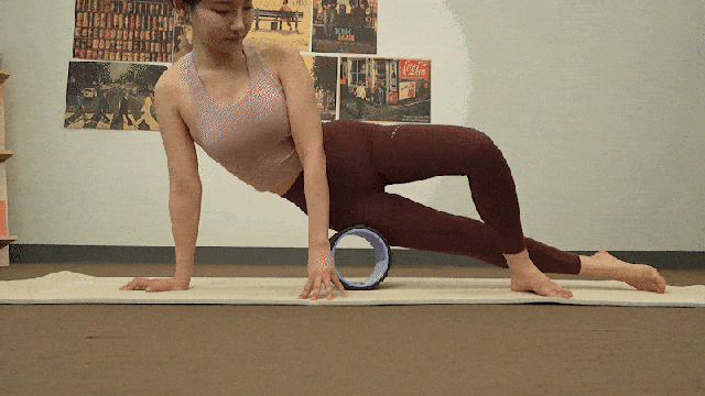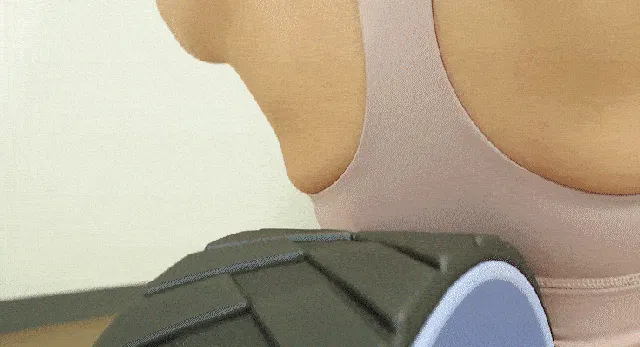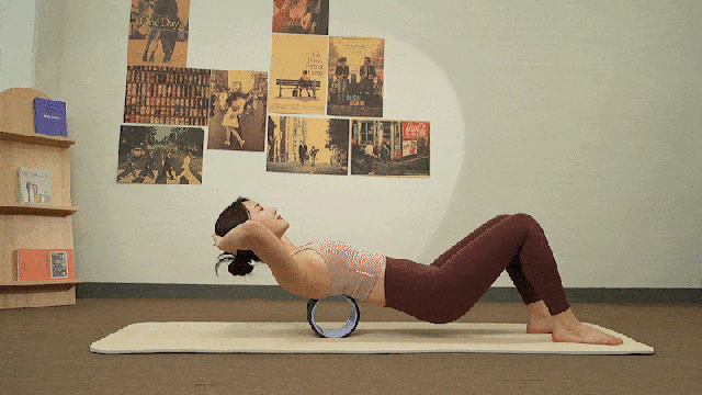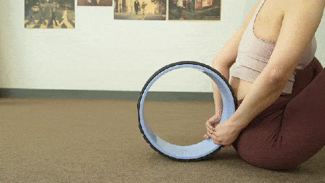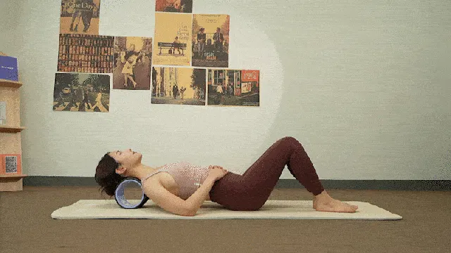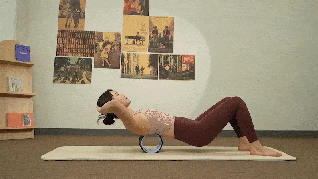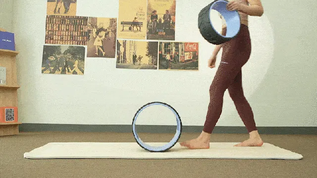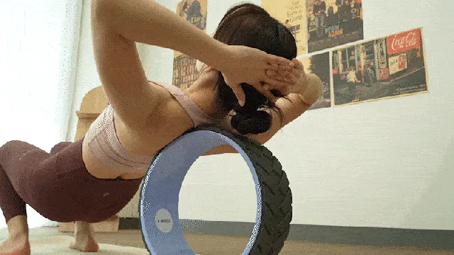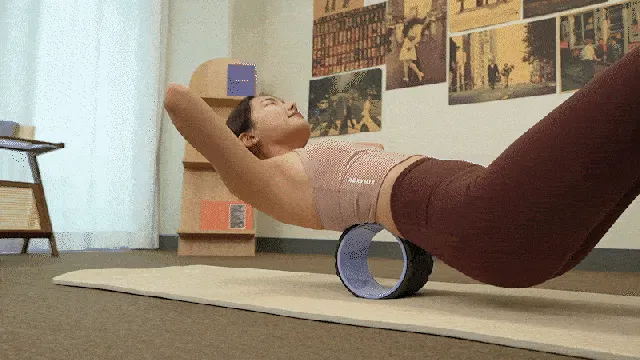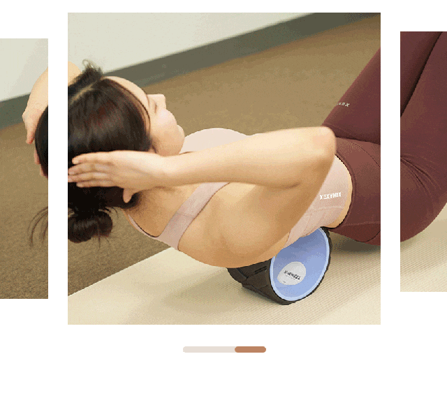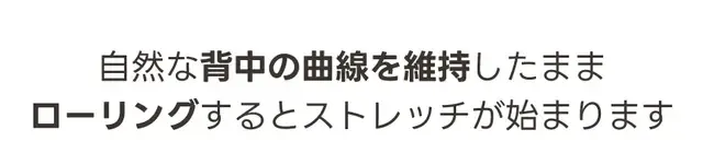 背中の肩甲骨の間にホイールを置いて仰向けに寝そべるような姿勢をすることで、背骨や背骨周辺の普段では伸ばしきれなかった細部まで気持ち良くストレッチができます。