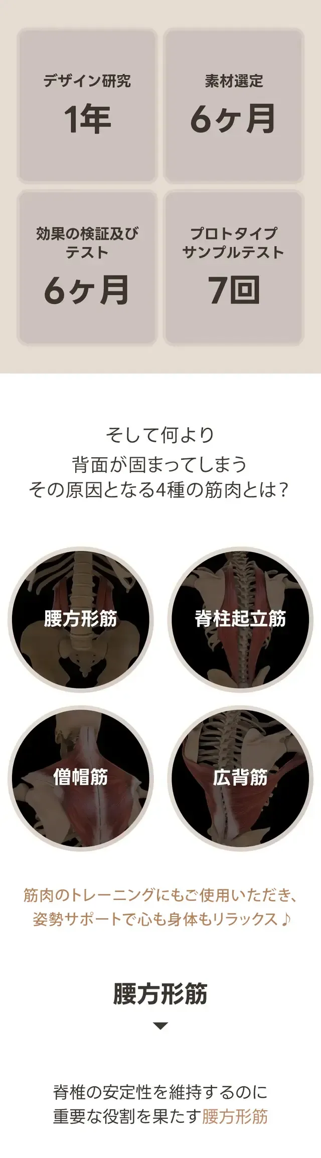 背中と接する広い部分に圧力が分散されるため、やさしい筋肉のケアが得られます。