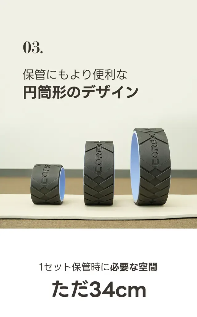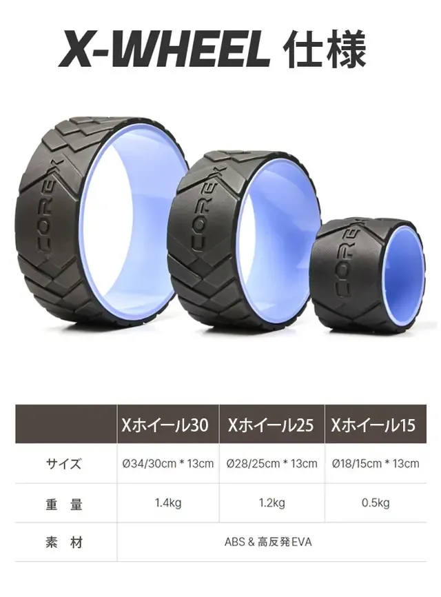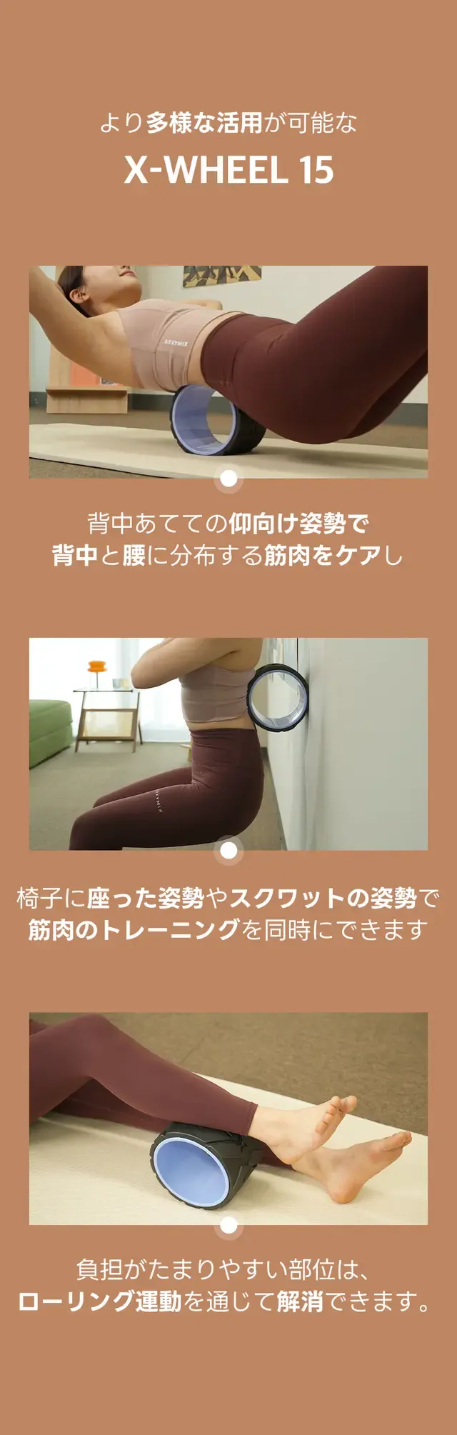 直径15cmのXホイール15は、普段からピラティスやヨガを経験している熟練者向けのサイズで、単なるストレッチ効果を超えて、自分が希望する部位を集中的にケアできるよう設計されています。