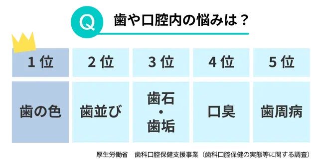 また、自分自身の歯の悩みで、歯の色について悩んでいる方もたくさんいらっしゃいます。「着色」「清掃不良」などが歯の色につながります。とくに着色は、コーヒー、紅茶、ワインやタバコなどで日々蓄積されていきます。「着色」「清掃不良」を防ぐには毎日こまめなケアが必要です。