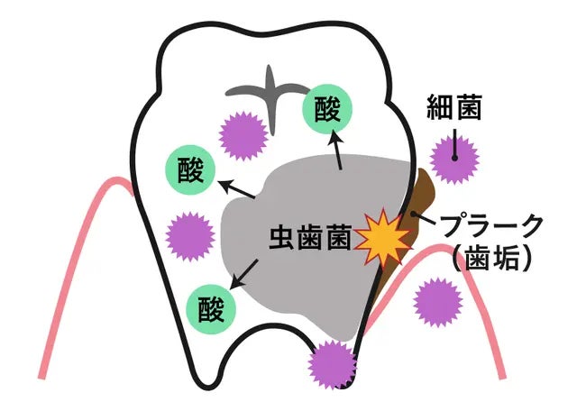 プラークという歯の表面に付着している細菌のかたまりが原因の1つといわれています。プラークは歯に付着する細菌やその代謝物の塊です。ネバネバとした黄白色や白色の塊が、私達の歯や歯肉に様々な悪影響を及ぼします。