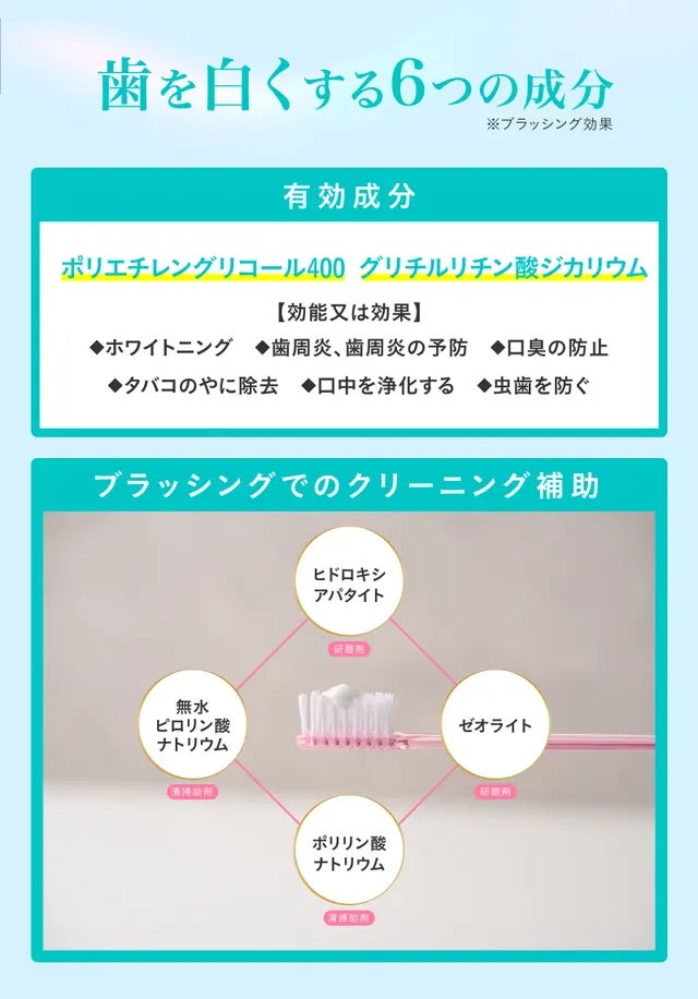 また、4つの成分がブラッシングのたび汚れを除去して、キレイな歯に導きます。