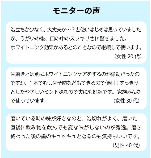商品企画者は、仕事と子育てに毎日奮闘する30代女性です。子どもが生まれる前はホワイトニングをふくめた美容にかけられる時間がありましたが、今ではもうそんな時間がない…!でも美容をあきらめたくない!という思いから、毎日のハミガキでホワイトニングケアもできるものにしたい、と考えて本商品を作りました。